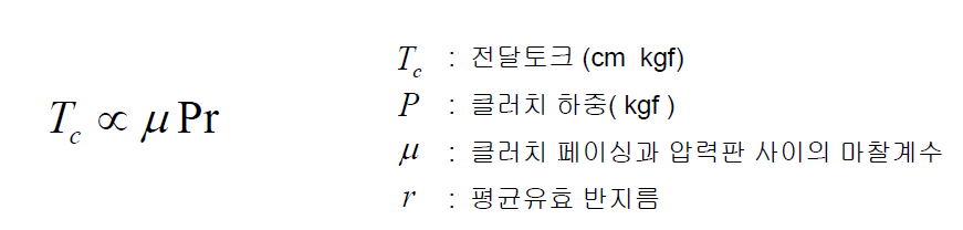 클러치가 전달할 수 있는 토크 용량은 보통 엔진의 최대 토크 보다 1.5 ~ 2.5배 정도입니다. 용량이 너무 크면 클러치 조작이 어렵고 동력 연결 시 충격으로 인해 엔진이 정지하기 쉬우며 반대로 용량이 너무 작으면 클러치가 미끄러져 동력을 충분히 전달할 수 없고 발열량이 커져 페이싱이 쉽게 마모 될 수 있습니다. 클러치 설계 시에는 (1)엔진의 변속기와 장치와 단속이 용이하고 조작이 원활해야함 (2)관성 모멘트가 작고 전달 토크가 커야함 (3) 클러치의 재료가 방열성이 크고 연속적인 단속에 과열되지 않아야함 을 만족해야 합니다.