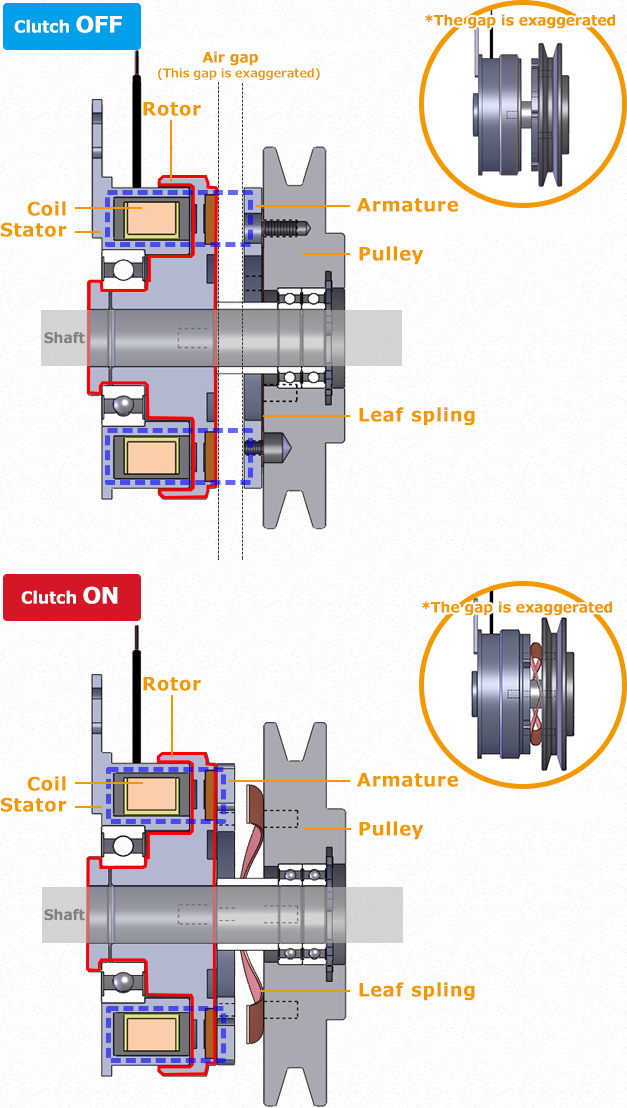 전자식 클러치(electromagnetic clutch)는 전자 코일의 자화 작용에 의하여 동력을 전달하는 클러치입니다. 회전하는 2개의 철제 원판 한 쪽에 전자석을 설치하여 전류를 주입하면 다른 쪽 원판이 자력에 의해 함께 회전하게 되는데, 이를 이용하여 전류를 ON, OFF 하여 함으로써 동력을 연결하고 차단 시키죠. 오토 클러치의 일종으로 클러치 페달은 없고 기어 레버를 작동하면 저절로 전류가 흐르는 마이크로 스위치로 조작합니다.