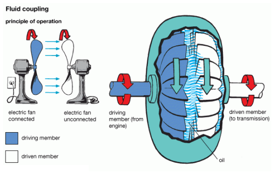 유체 클러치(Fluid clutch)는 유체인 오일을 이용한 클러치로 주로 자동 변속기에 많이 쓰이는 방식입니다. 케이스 안에 오일을 채우고 터빈 (날개)를 서로 마주 보게 설치하여 엔진 구동력으로 한 쪽을 돌리면 다른 쪽 날개도 돌아가는 원리로 유체를 회전시켜 동력을 전달 합니다. 클러치 페달을 밟으면 -> 푸시 로드를 밀어 마스터 실린더에 힘을 가해 오일을 압축하고 - > 압축된 오일이 마스터 실린더에서 유압관을 통해 서보 실린더로 이동하여 푸시 로드를 밀고 -> 푸시 로드는 클러치 포크를 작동시켜 클러치 연결을 끊습니다.
