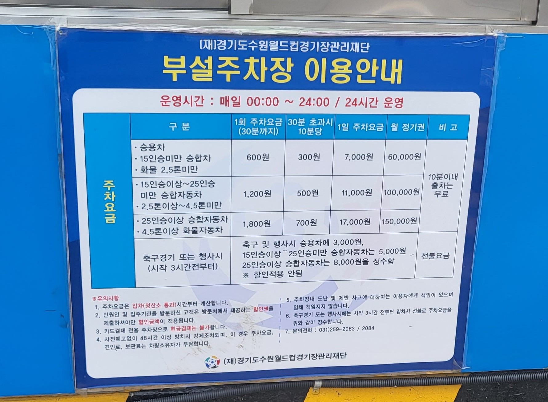 수원 월드컵 경기장 시간 별 주차 요금입니다