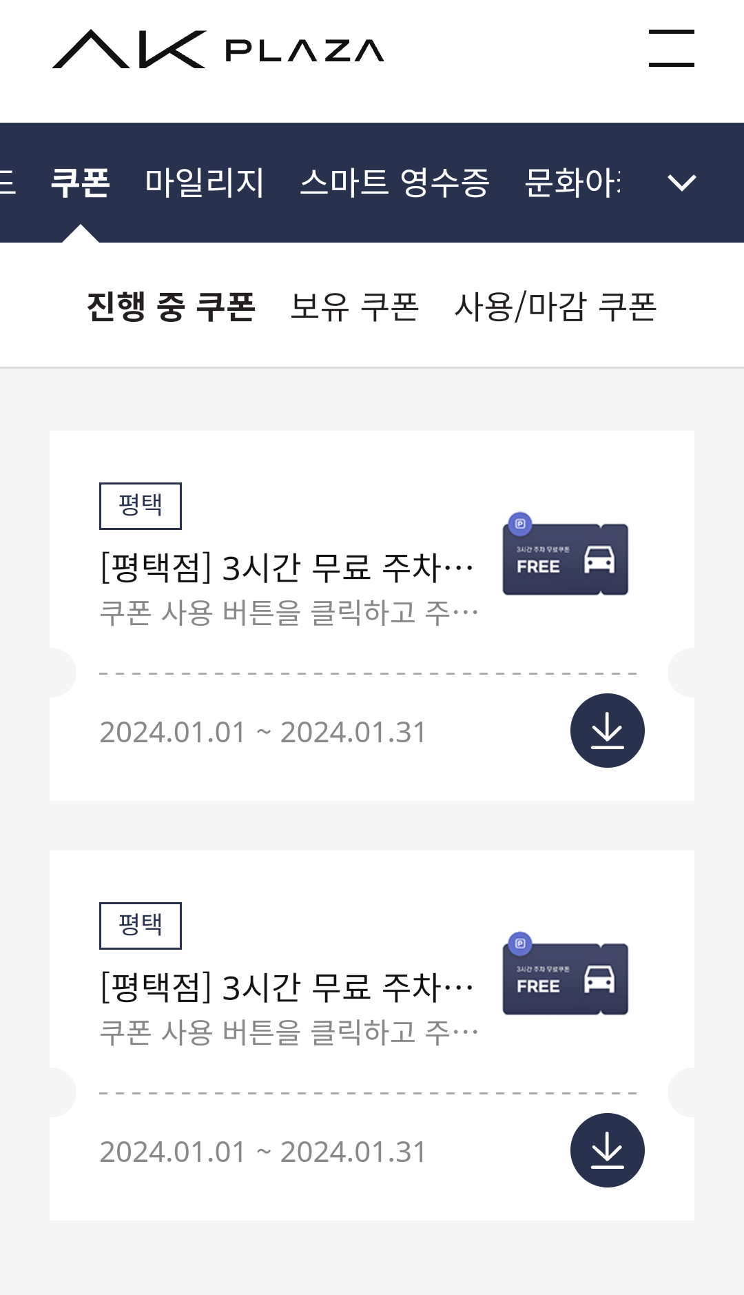 위의 스크린샷과 같이 3시간 무료 주차 쿠폰이 있는걸 확인 할 수 있어요 ㅎㅎ