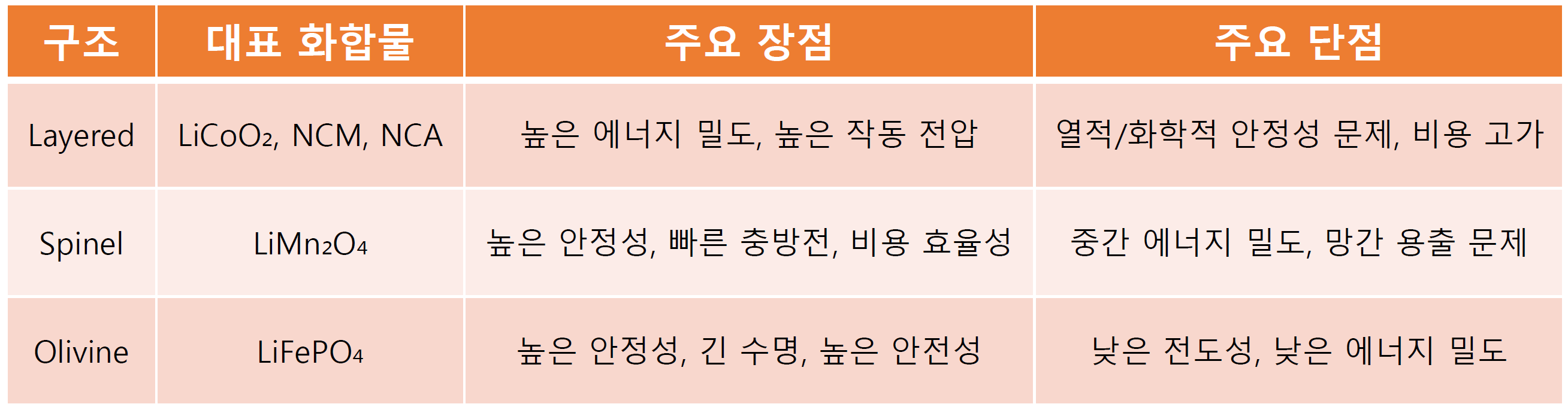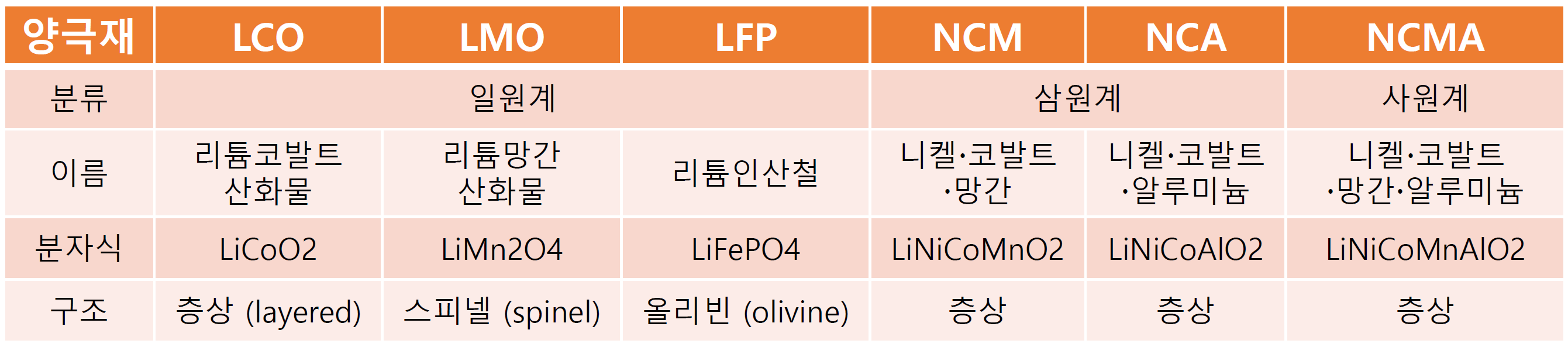 - 층상(Layered): LCO, NCM, NCA 등