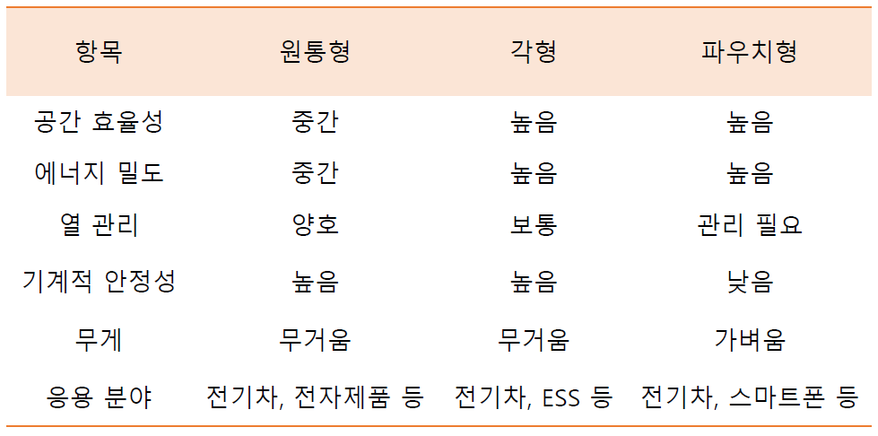 - 공간 효율성: 셀 모양을 자유롭게 조절 할 수 있어 배터리 팩 내부 공간을 최대한 활용할 수 있음