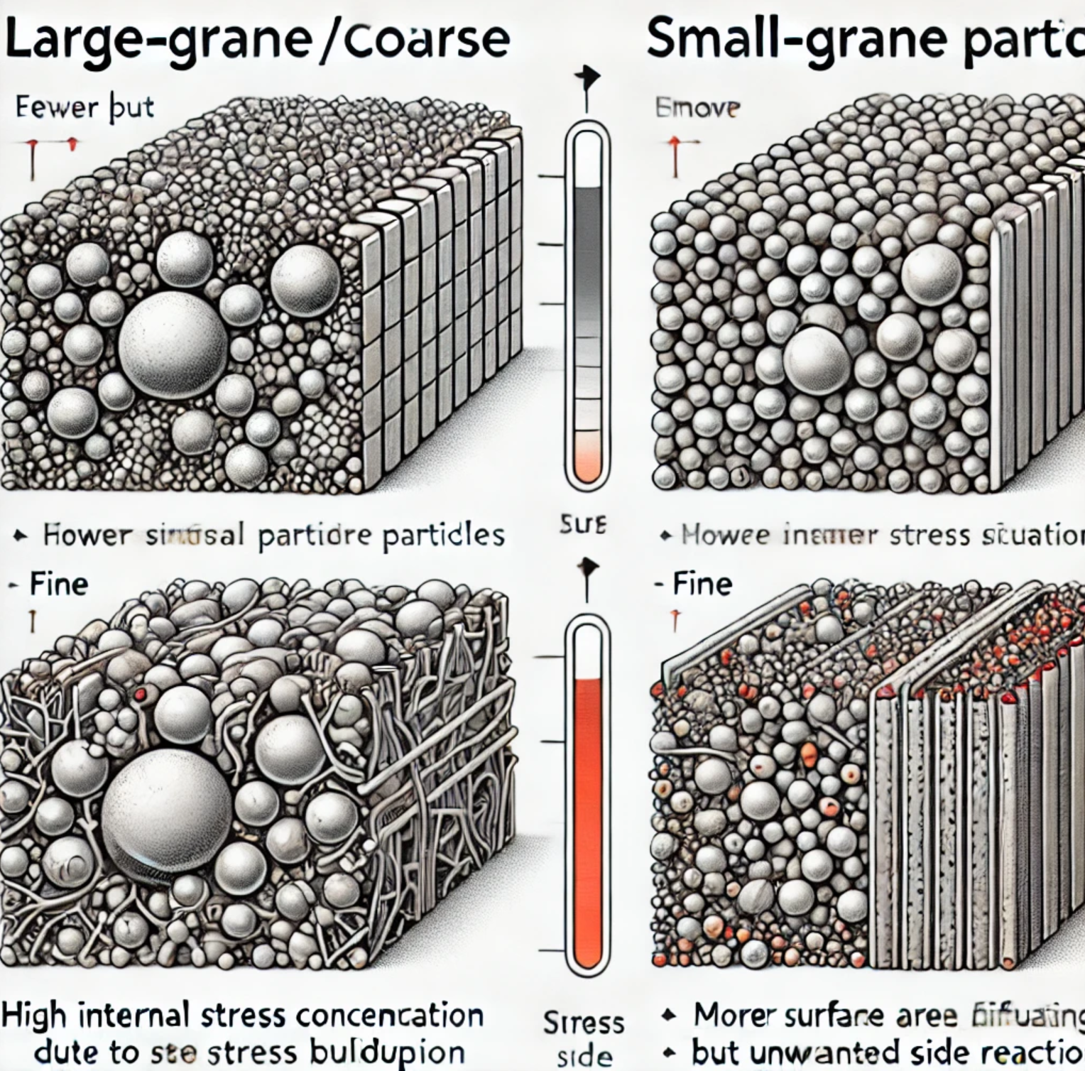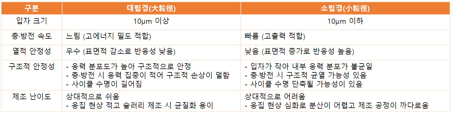 10µm 이상(10~20µm)은 대립경이라고 합니다. 입자의 크기로 인해 그 성질도 달라지는데요, 대립경은 상대적으로 크기가 커서 충 · 방전 속도도 느리고 열적 안정성도 높은 반면 소립경은 충·방전 속도가 빠르고 표면 반응성이 높아 고온 환경에서 분해 위험도 큰 편입니다. 대립경과 소립경의 특징을 정리하자면 아래와 같습니다.