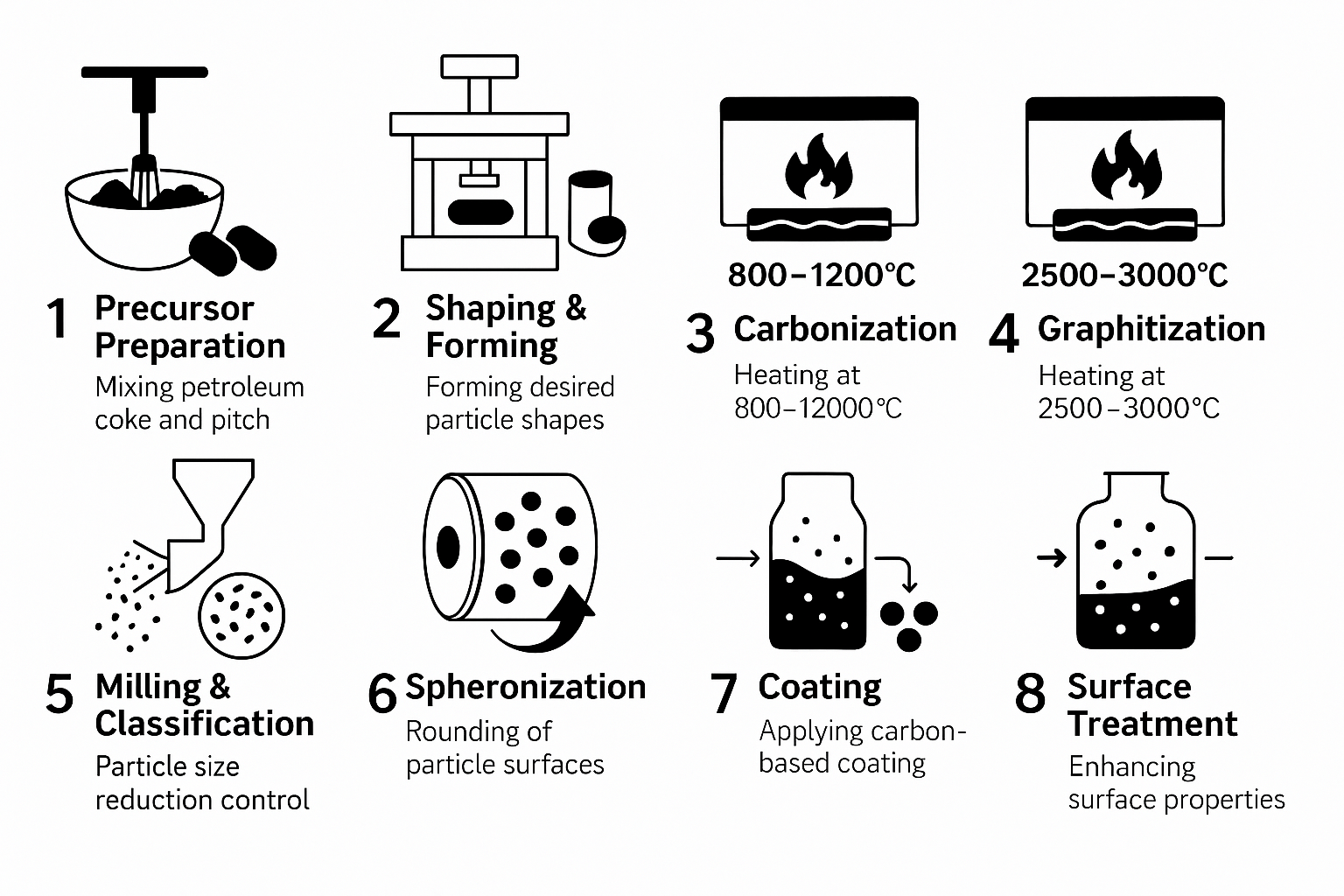 인조흑연은 석유계 또는 석탄계 피치를 기반으로 한 탄소 전구체를 고온 열처리하여 제조됩니다. 일반적인 제조 공정은 다음과 같습니다.