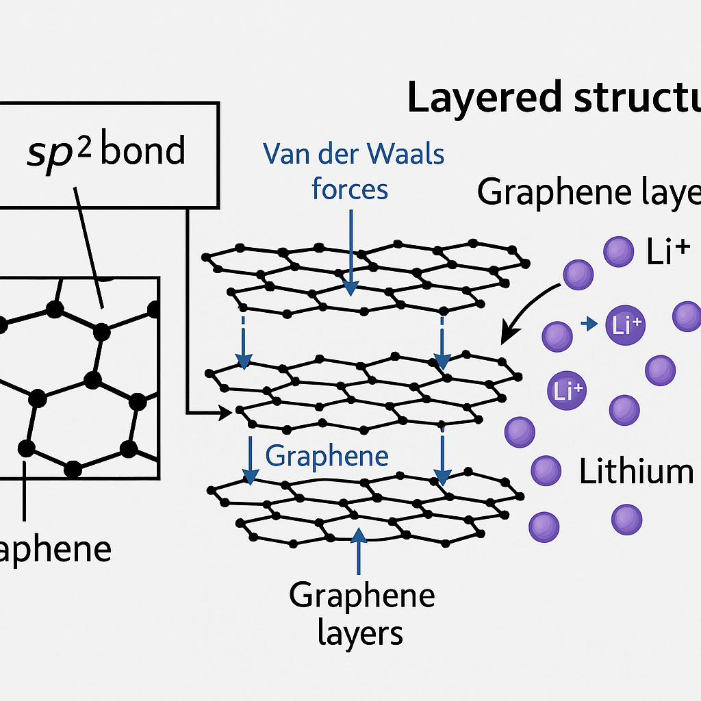 인조흑연은 sp² 결합을 이루는 탄소 원자들이 육각형 벌집 구조를 이루는 그래핀 층(graphene layer)으로 구성되어 있으며, 이러한 층들이 규칙적으로 쌓인 층상 구조(layered structure) 를 가집니다. 각 그래핀 층은 반데르발스 힘에 의해 느슨하게 결합되어 있어, 리튬 이온이 층 사이로 자유롭게 삽입되고 탈리되는 특성을 가집니다. 이러한 구조 덕분에 인조흑연은 우수한 전기전도성, 높은 구조 안정성, 양호한 리튬 확산성을 발현할 수 있으며, 이는 음극재로서의 성능을 결정짓는 핵심 요소입니다.
