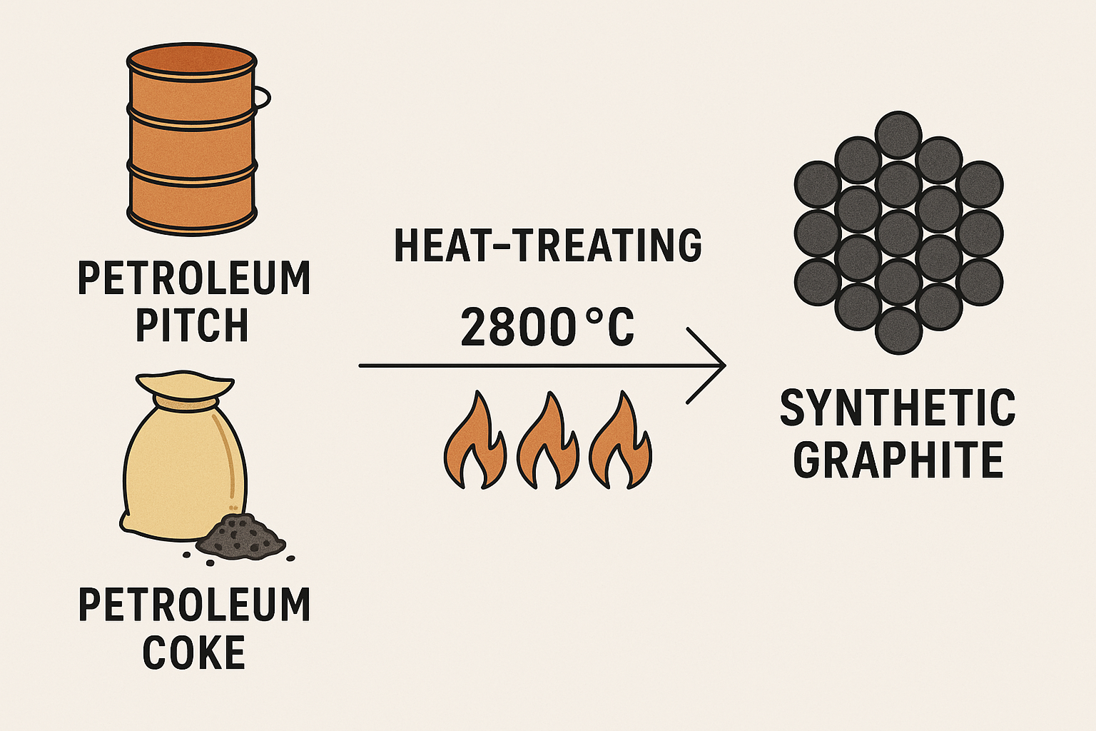 인조흑연은 석유계 피치(petroleum pitch), 석유 코크스(petroleum coke) 등의 탄소 원료를 출발물질로 하여 합성됩니다. 열처리 온도에 따라 결정성이 달라지는데, 일반적으로는 높은 결정성과 전도성을 확보를 위해서 2800°C 이상의 온도에서 열처리를 합니다.
