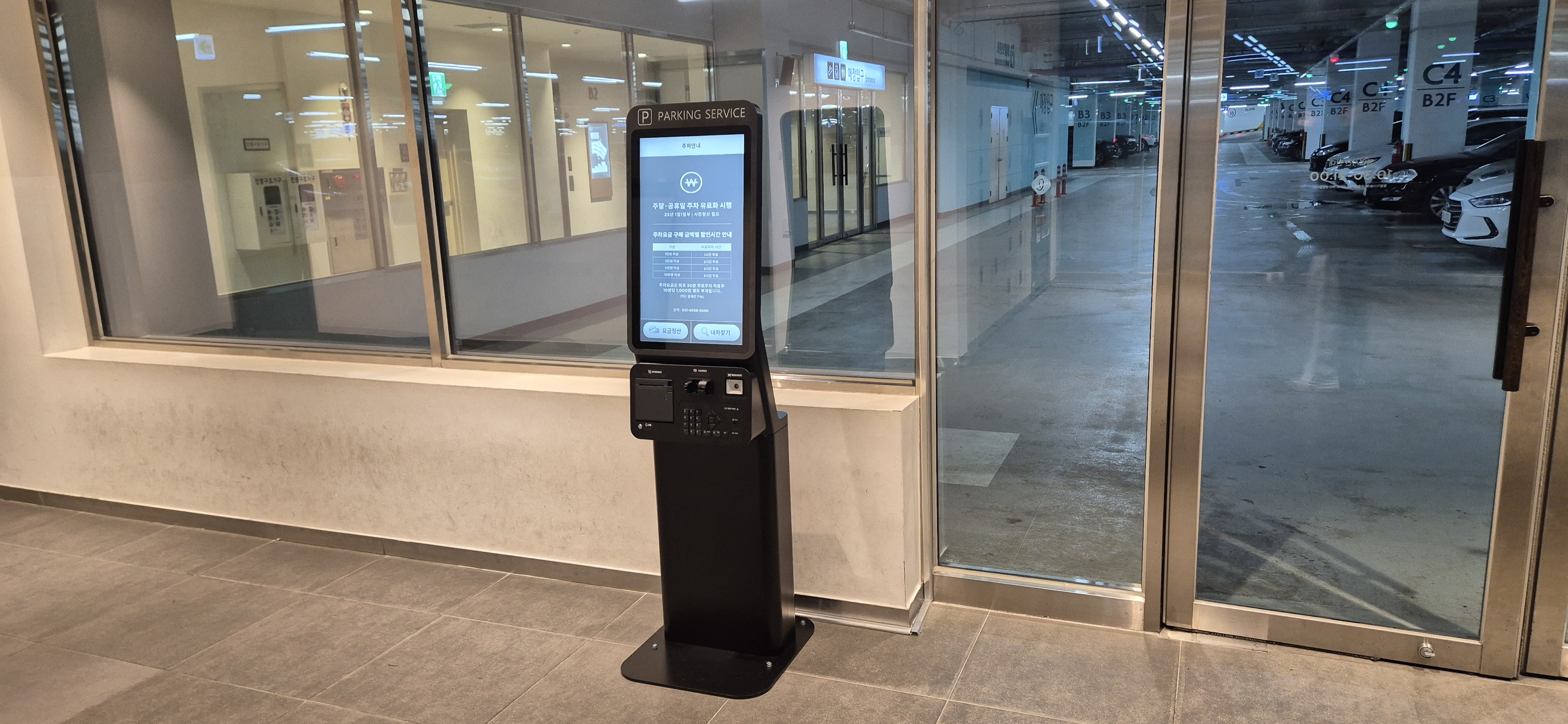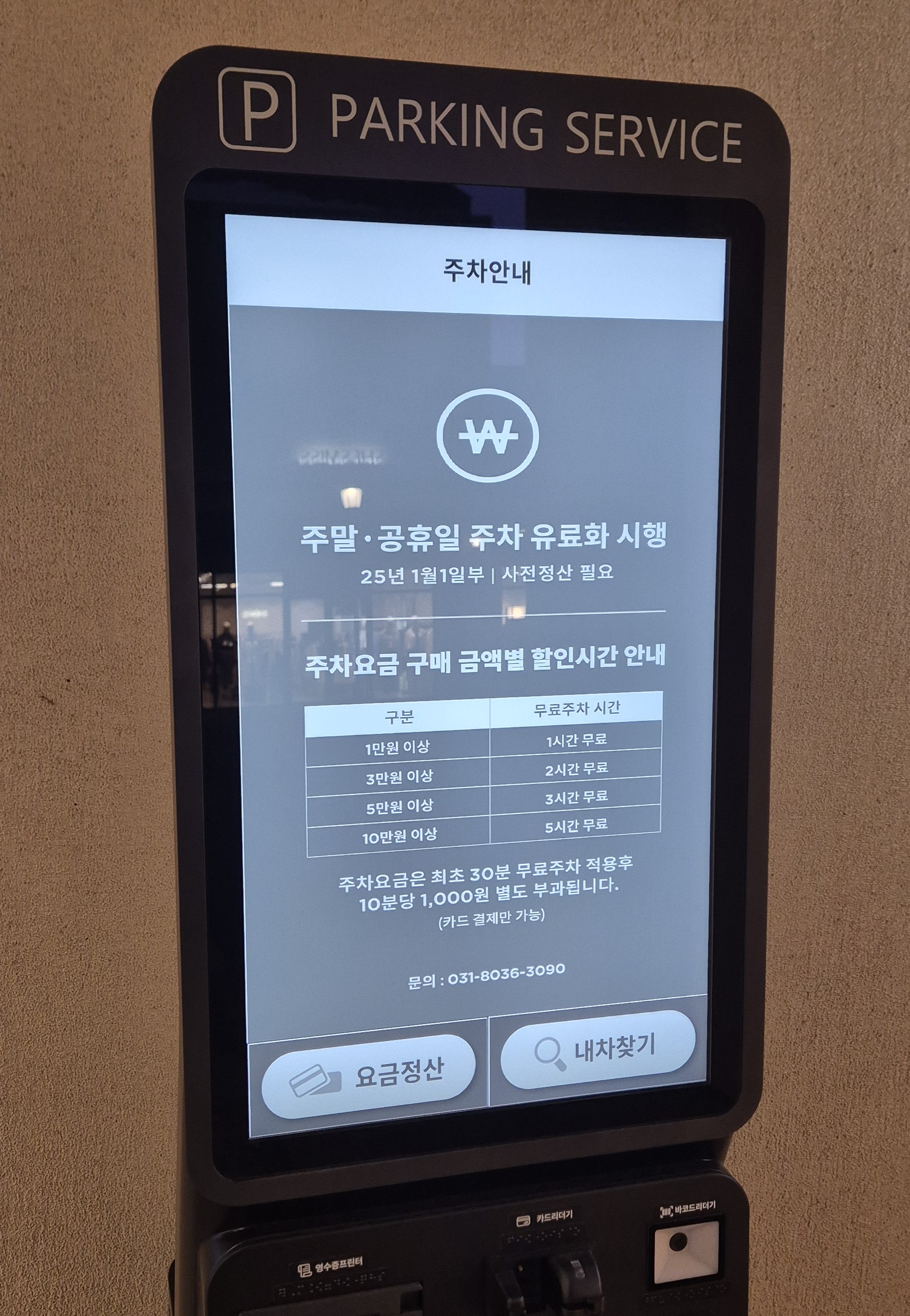 주차장 무인 정산기를 통해 영수증 바코드로 무료시간 등록 할 수 있으니