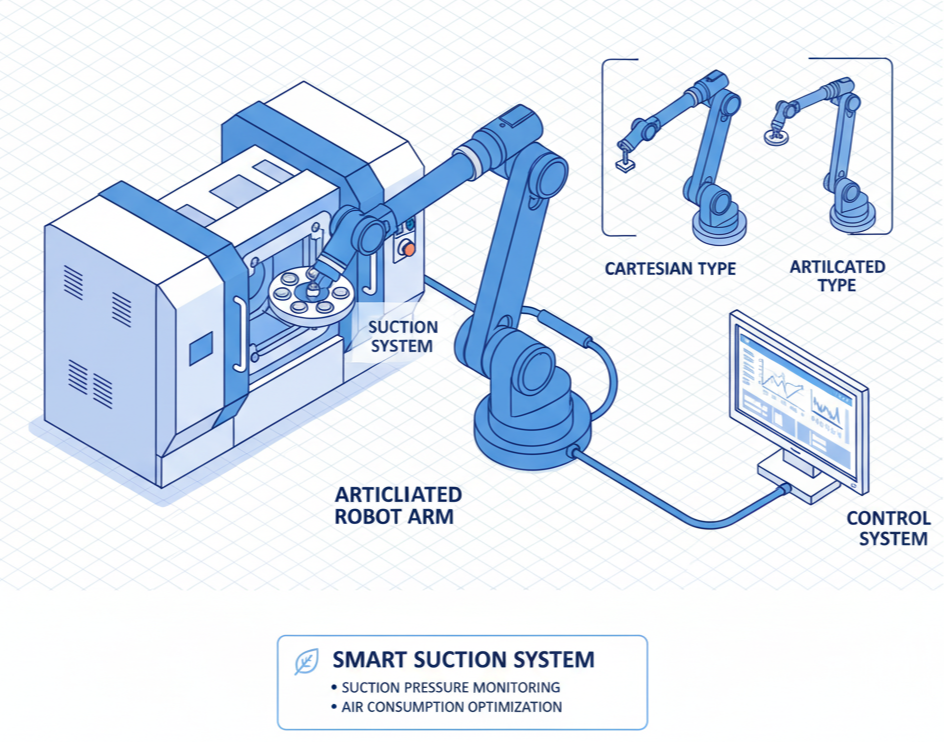 - 흡착 장치(Suction System): 제품을 안전하게 잡기 위한 진공 흡착 시스템입니다. 흡착압력을 감시하여 에어 소비량을 최적화하는 스마트 흡착 시스템도 있습니다.