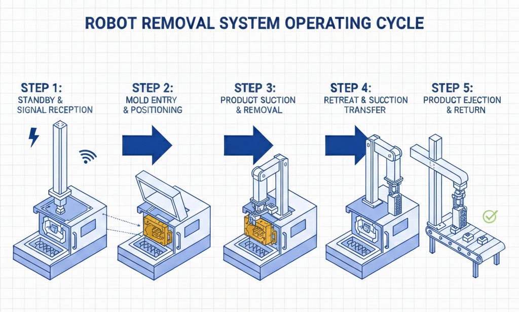 취출로봇은 사출 성형기로부터 사출 완료 신호를 받을 때까지 대기 위치에 있습니다. 이때 로봇은 금형이 열리기를 기다리며, 사출기의 냉각 시간이 완료될 때까지 정지 상태를 유지합니다. 사출 성형 공정에서는 금형 닫힘, 사출, 보압, 계량, 흘림방지 과정이 완료된 후에야 금형이 개방됩니다. 이 모든 과정이 완료되면 취출로봇에 작동 신호가 전달됩니다.