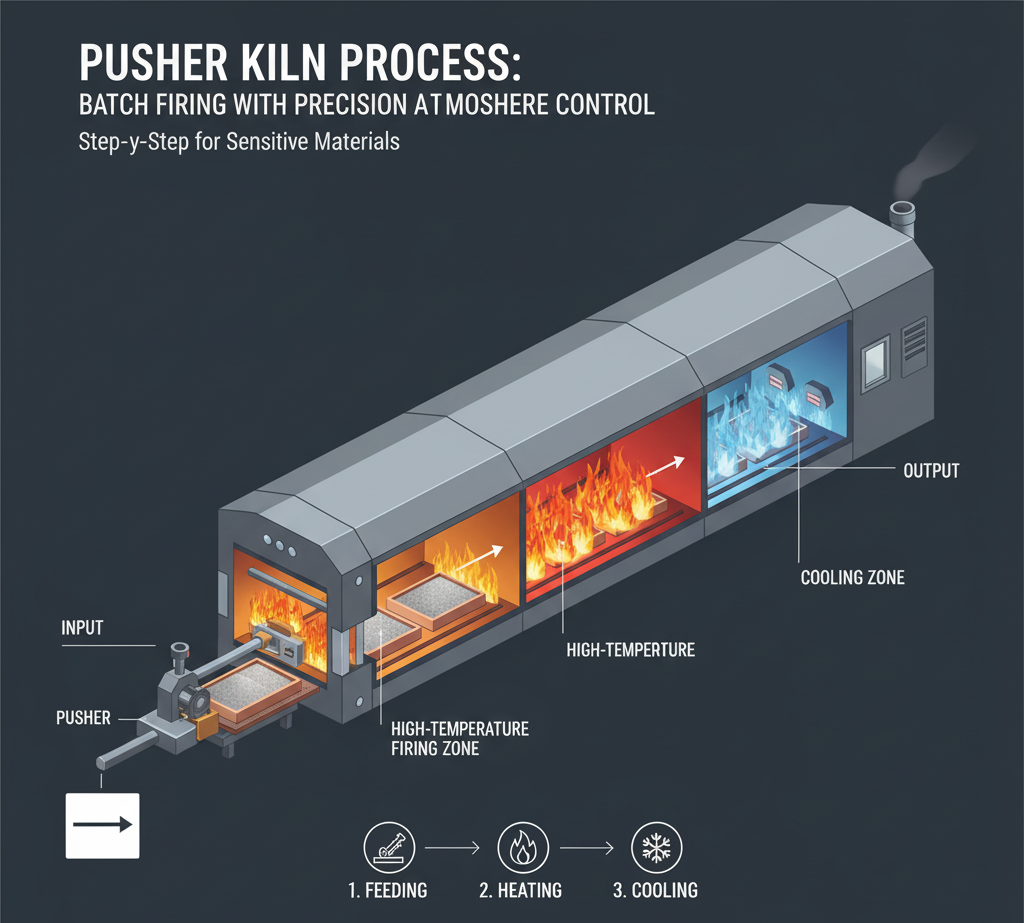 푸셔 킬른은 카트나 내화물 용기를 하나씩 소성로 챔버 내부에 밀어 넣고, 일정 체류 시간을 거쳐 다른 쪽에서 밀어내는 방식의 배치식 소성 설비입니다. 밀폐된 챔버 내에서 온도와 분위기를 엄격히 제어할 수 있어 고품질, 민감한 소재 소성에 적합합니다.