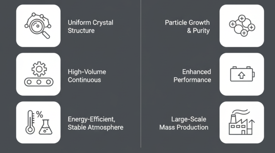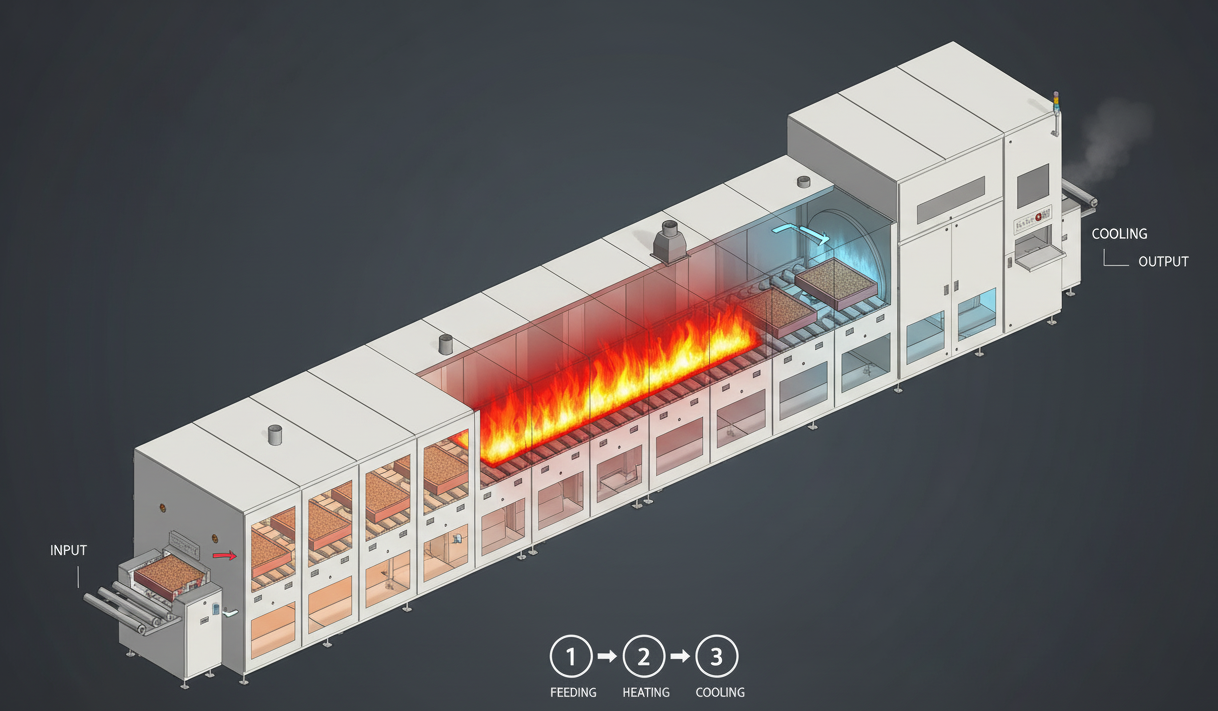 롤러 타입 소성로의 작동 원리는 마치 컨베이어 벨트 위에서 피자를 굽는 오븐과 같습니다. 내부에서는 금속이나 내화물로 만든 여러 개의 롤러가 연속해서 돌아가는데, 이 위에 양극재가 들어있는 새거(용기)를 위에 올려놓으면, 천천히 굴러가면서 온도가 다른 여러 구역을 지나가게 됩니다. 각 구간마다 온도가 다르게 설정되어 있어, 천천히 예열되고, 이어서 고온 구간에서 빠르게 구워지며, 마지막으로 냉각 구간을 지나 완성되는 것이죠.