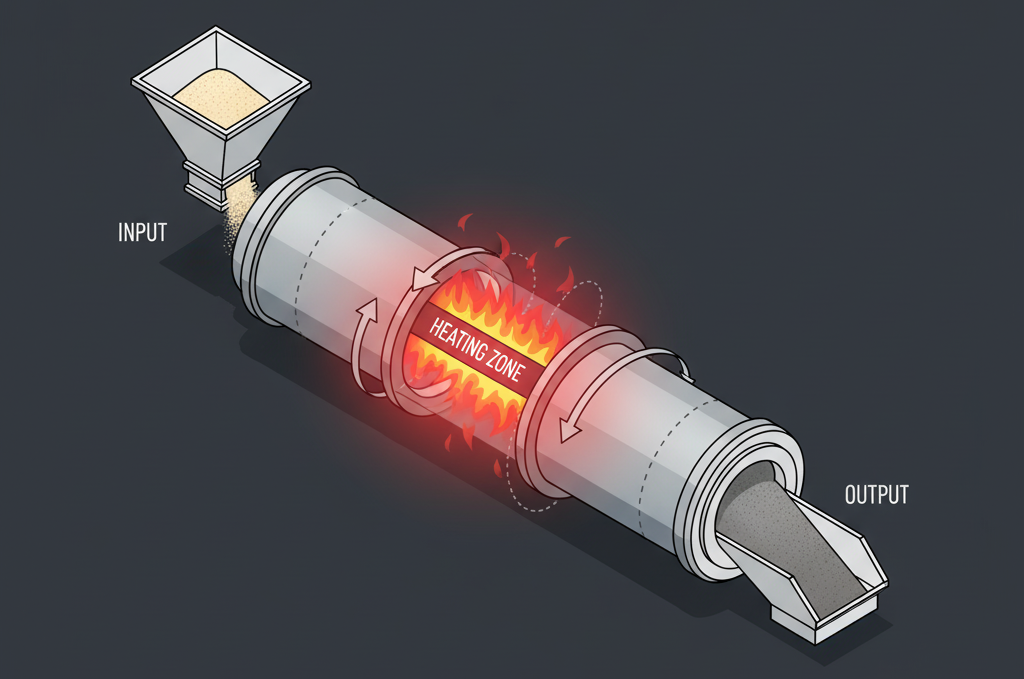 회전로는 거대한 기울어진 난로 안에 긴 통이 천천히 회전하는 구조입니다. 이 회전하는 원통 안에 원료를 넣으면, 원통이 회전하고 약간 기울어져 있기 때문에 재료가 안에서 굴러내려가며 이동합니다. 이동하면서 열이 가해지고, 원재료가 고르게 열을 받도록 계속 섞이고 굴러갑니다. 마치 커다란 롤러에서 반죽이 굴러가면서 익는 모습을 상상하시면 됩니다. 전체 공정이 연속적이긴 하지만 다만 내부 온도를 단계적으로 조절하기 어렵다는 단점이 있습니다.