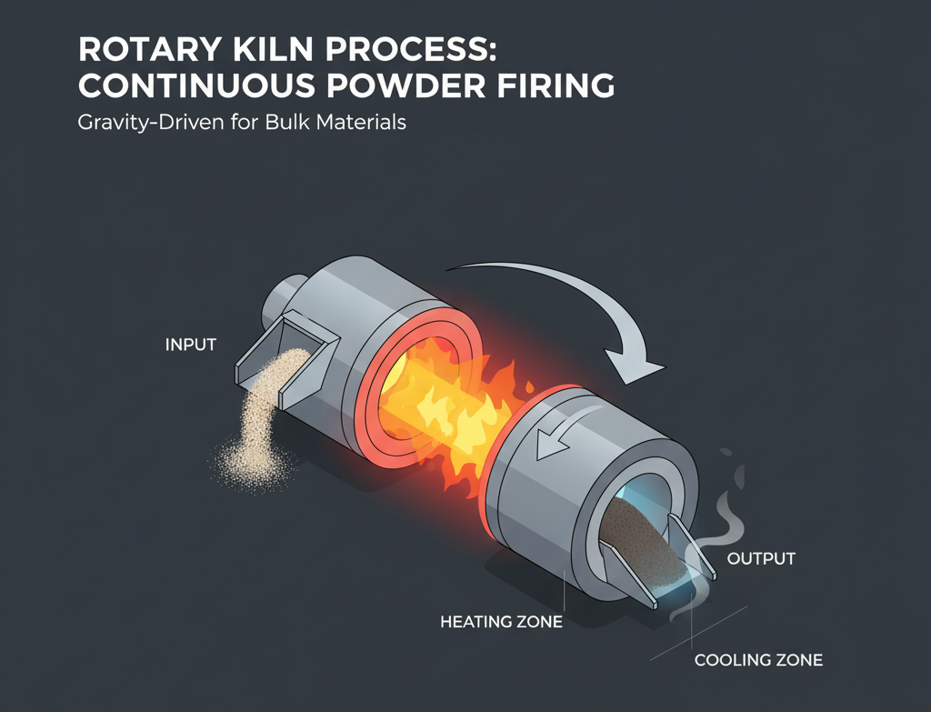 회전로는 경사진 원통형 내화물 챔버를 천천히 회전시켜 원료를 외부에서 내부로 굴려서 열처리하는 연속식 소성로입니다. 중력과 회동에 의해 원료가 내부를 이동하면서 연속적으로 고온 처리가 이루어집니다. 주로 벌크 분말이나 입상 형태 원료를 처리하는 데 적합합니다.