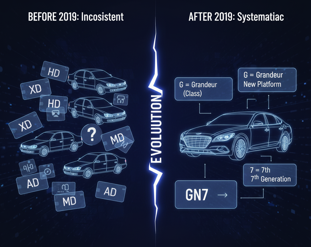 현대자동차는 2019년 이전까지 "임의 알파벳 + 차급 알파벳" 방식을 사용했어요. 예를 들어 아반떼는 XD, HD, MD, AD 같은 식이었죠. 하지만 이 방식은 일관성 없이 알파벳을 임의 부여하다 보니 세대 구분에 혼란이 있었습니다. 그래서 2019년부터 현대차는 체계적이고 명확한 신규 코드네임 체계를 도입했습니다. 이제는 코드네임만 봐도 차급, 브랜드, 세대를 한눈에 파악할 수 있게 되었어요.