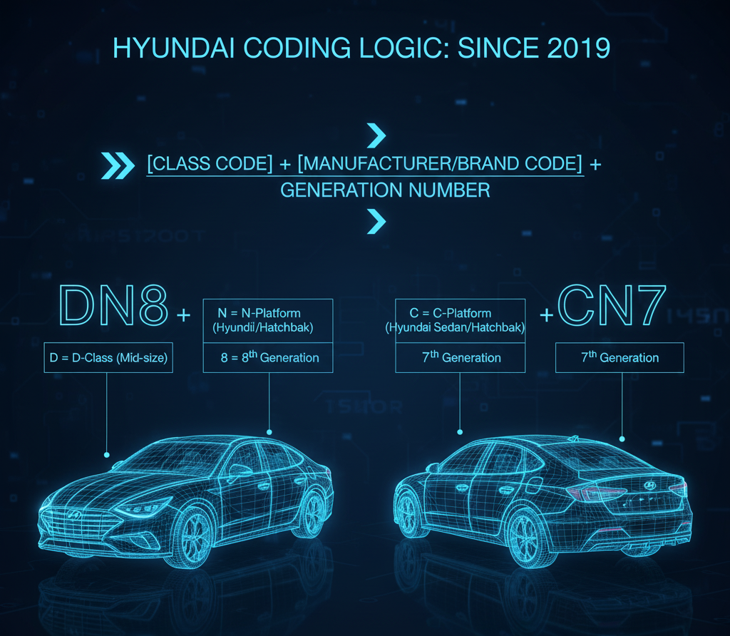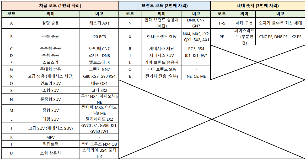 2019년 이후 코드는 [차급 코드] + [제조사/브랜드 코드] + [세대 숫자] 3자리 구조로 표준화되었어요. 쏘나타 8세대 DN8을 예로 들면, D(중형) + N(현대 세단) + 8(8세대)로 해석됩니다. 아반떼 7세대 CN7은 C(준중형) + N(현대 세단) + 7(7세대)이죠.