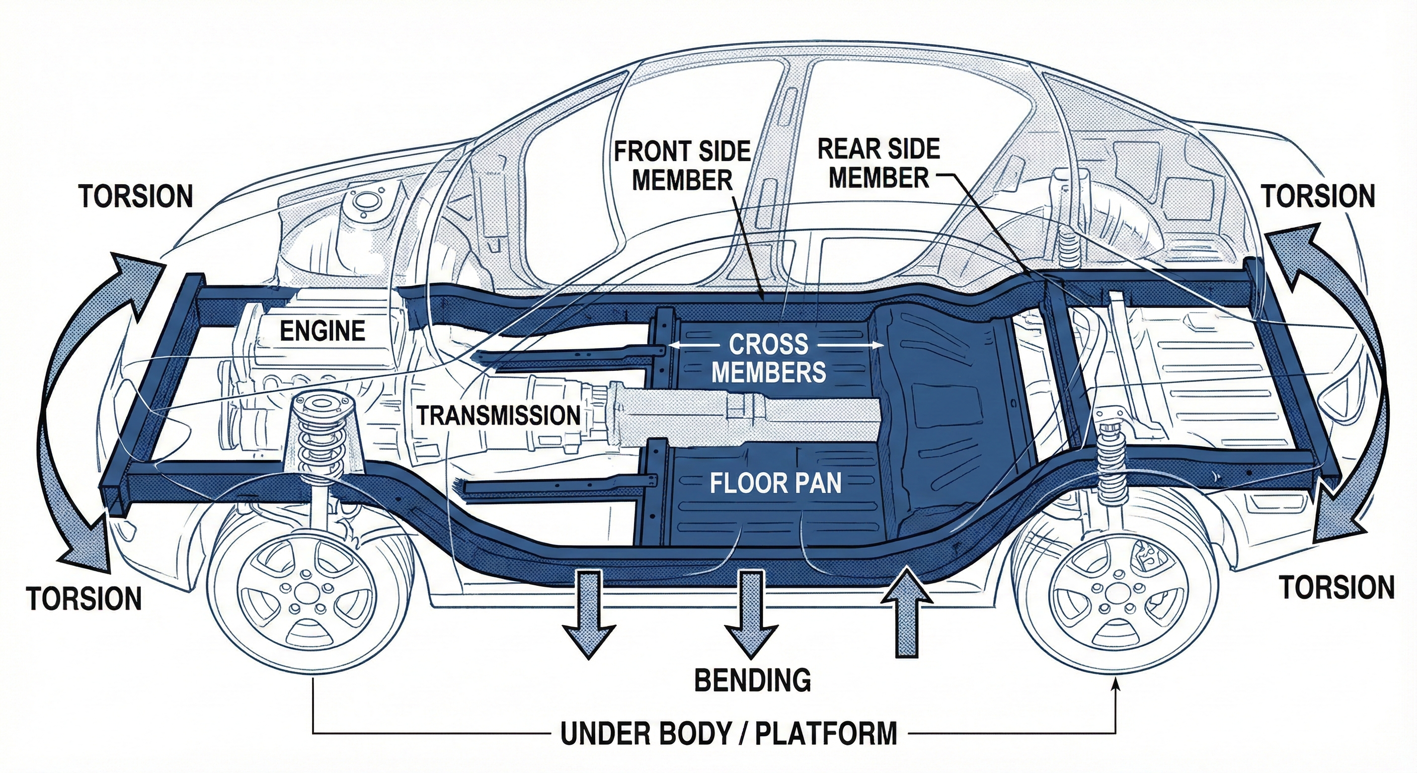 가장 핵심이 되는 것은 언더 바디입니다. 흔히 '플랫폼'이라 불리는 이 영역은 자동차의 척추와 같습니다. 엔진과 변속기, 서스펜션 등 무거운 섀시 부품들이 모두 이곳에 장착되기 때문입니다. 언더 바디는 주행 중 노면에서 올라오는 끊임없는 충격과 코너링 시 발생하는 비틀림(Torsion), 급제동 시의 굽힘(Bending) 모멘트를 가장 앞에서 견뎌내야 합니다. 특히 바닥을 가로지르는 프론트/리어 사이드 멤버(Side Member)와 플로어 팬(Floor Pan)은 유기적으로 결합되어 '면내 전단 강성(In-plane Shear Stiffness)'을 확보합니다. 이는 차체가 종잇장처럼 구겨지거나 뒤틀리지 않게 잡아주는 핵심적인 역할을 수행합니다.