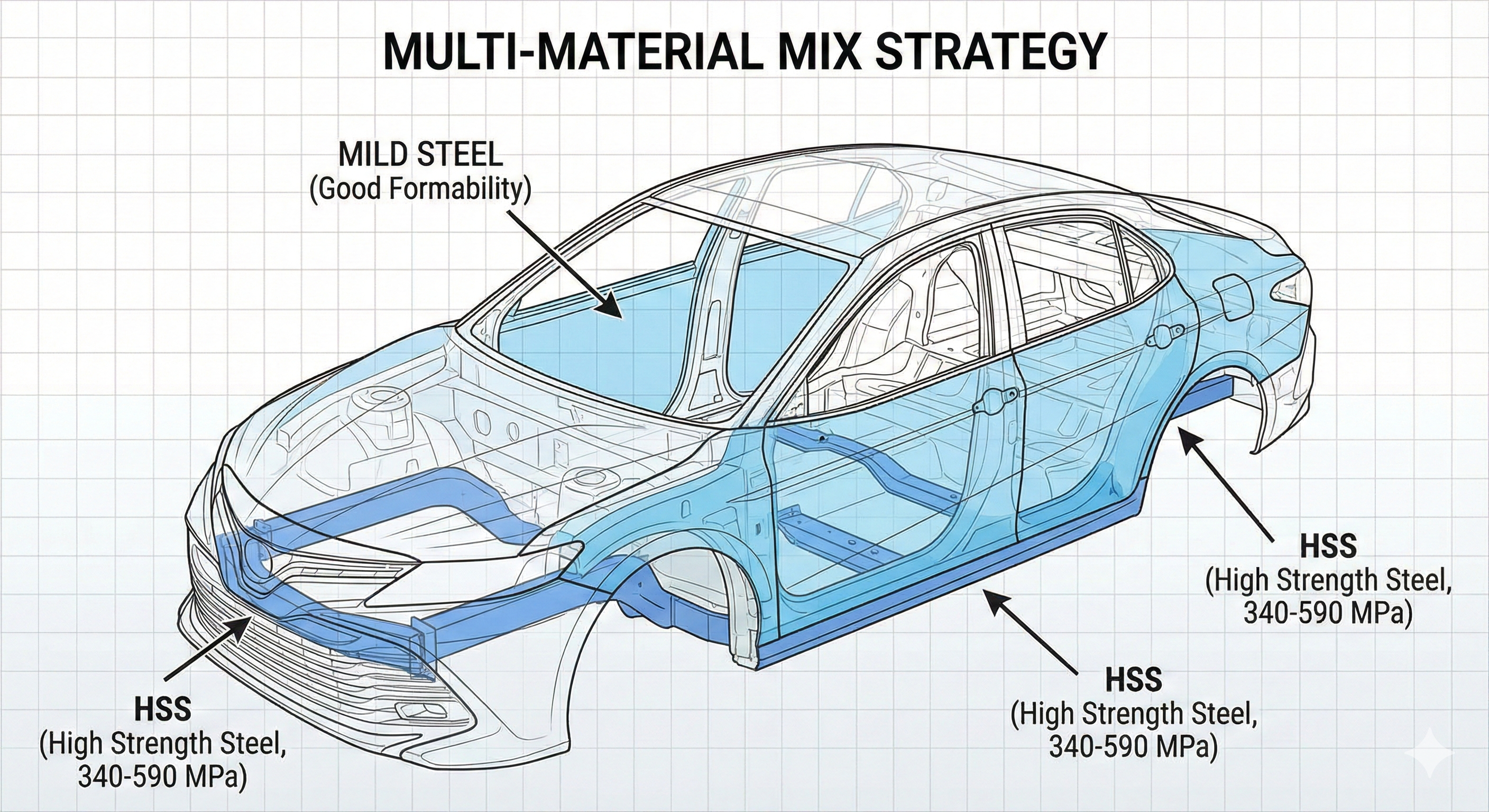 과거의 차체는 연강(Mild Steel) 위주로 만들어졌지만, 지금은 강화된 안전 법규와 연비 규제를 동시에 만족시키기 위해 다중 소재(Multi-Material Mix) 전략을 사용합니다. 즉, 부위별 역할에 따라 서로 다른 성질의 철을 사용하는 것입니다. 복잡한 형상으로 찍어내야 하는 도어 외판이나 펜더에는 가공성이 좋은 연강을 사용하지만, 차체의 뼈대가 되는 멤버류에는 인장강도 340~590MPa 급의 고장력강(HSS)을 사용합니다.
