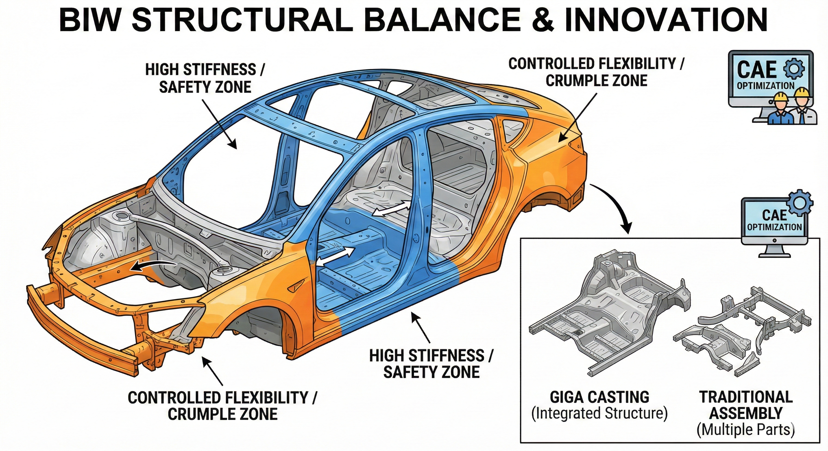 결국 훌륭한 BIW란 '단단해야 할 곳은 단단하고, 유연해야 할 곳은 유연한' 역학적 밸런스를 갖춘 차체를 의미합니다. 차체 설계 엔지니어들은 지금 이 순간에도 수만 번의 컴퓨터 해석(CAE)을 통해 0.1mm의 두께를 조절하고, 새로운 소재를 시험하고 있습니다. 최근에는 테슬라가 주도하는 기가 캐스팅(Giga Casting) 기술이 등장하며, 수십 개의 부품을 하나의 거대한 주조품으로 찍어내는 제조 공정의 혁명까지 일어나고 있습니다. 우리가 도로 위에서 안전하게, 그리고 즐겁게 달릴 수 있는 것은 이처럼 보이지 않는 곳에서 치밀하게 설계된 '철의 요새'가 우리를 감싸고 있기 때문입니다.