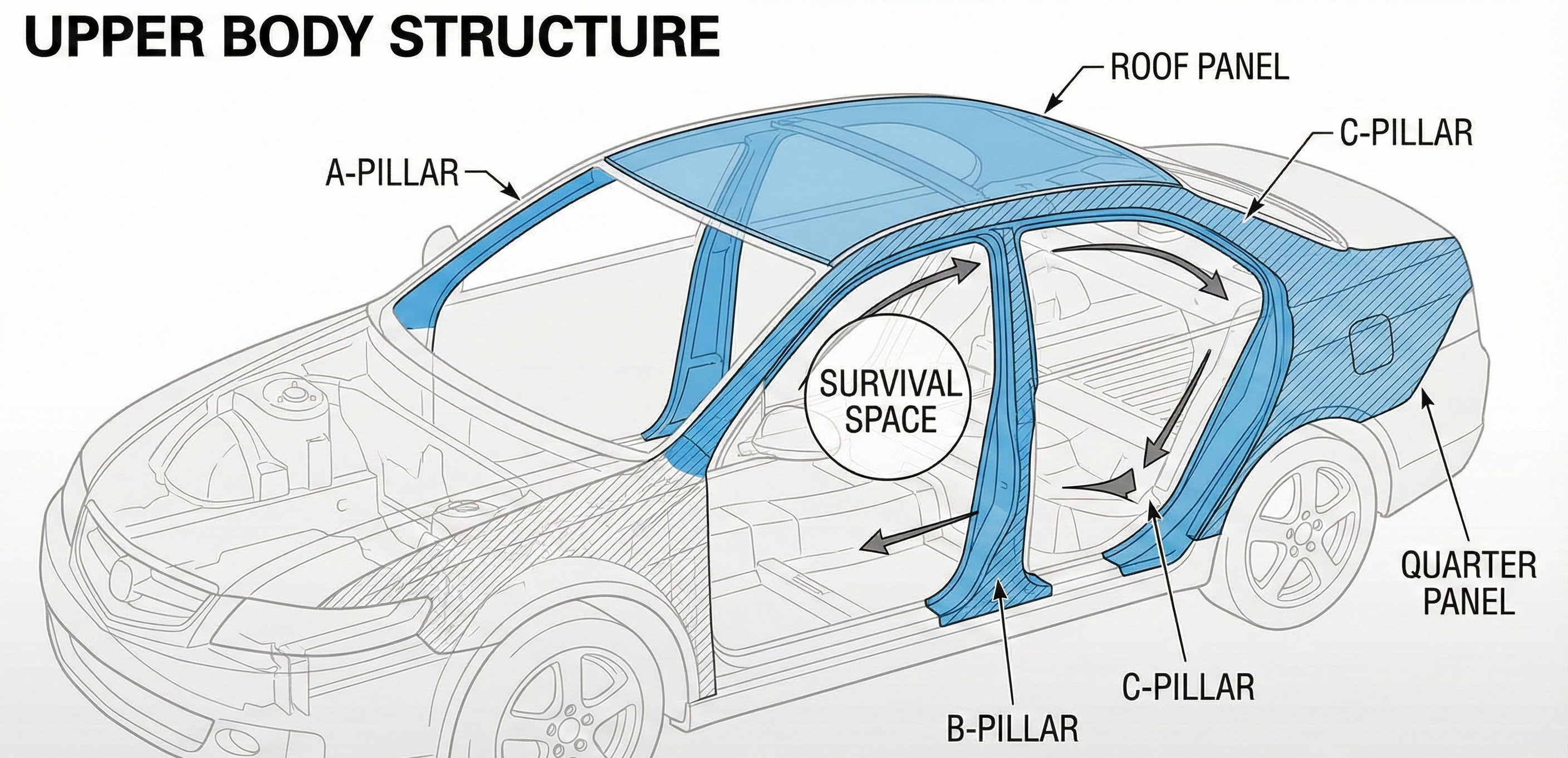 반면 어퍼 바디는 우리가 눈으로 보는 A, B, C 필러와 루프, 쿼터 패널 등을 포함합니다. 이들은 언더 바디 위에서 거주 공간을 형성하는 동시에, 전복(Rollover) 사고 시 천장이 내려앉지 않도록 버티는 생존 공간(Survival Space) 확보의 임무를 띠고 있습니다.