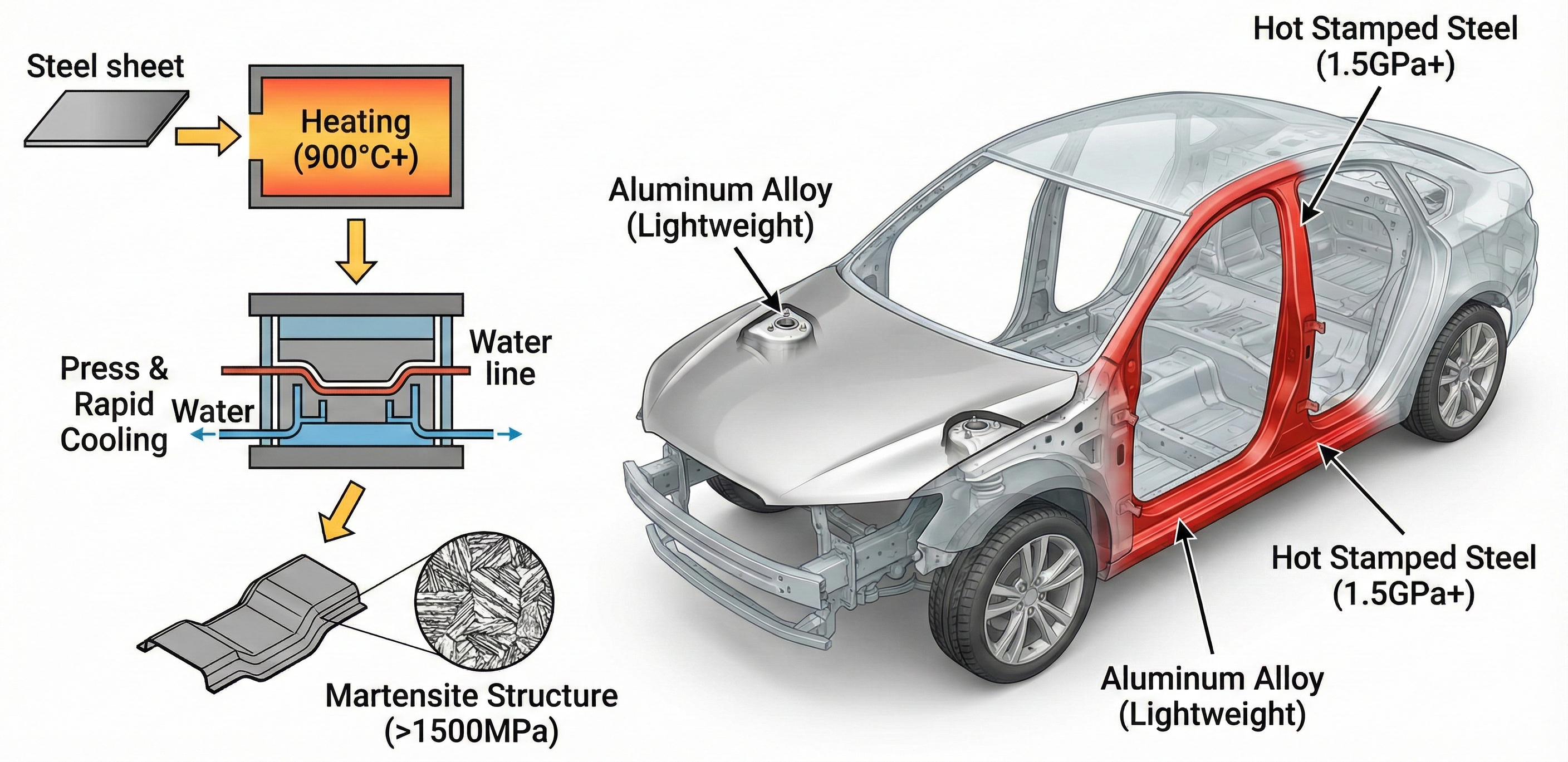 더 나아가 승객 보호가 절대적인 B필러나 사이드 실에는 1,500MPa(1.5GPa) 이상의 강도를 자랑하는 핫 스탬핑(Hot Stamping) 강판이 적용됩니다. 이는 900도 이상으로 벌겋게 달군 철판을 프레스로 찍음과 동시에 급속 냉각시켜, 철의 조직을 단단한 마르텐사이트(Martensite)로 변화시키는 공법입니다. 이를 통해 얇은 두께로도 극강의 강도를 확보하여 경량화와 안전이라는 두 마리 토끼를 잡을 수 있습니다. 제네시스나 벤츠 같은 프리미엄 브랜드는 여기서 한 발 더 나아가 후드나 서스펜션 마운트 등에 알루미늄 합금을 적극적으로 도입하여 차체 무게 배분까지 최적화하고 있습니다.