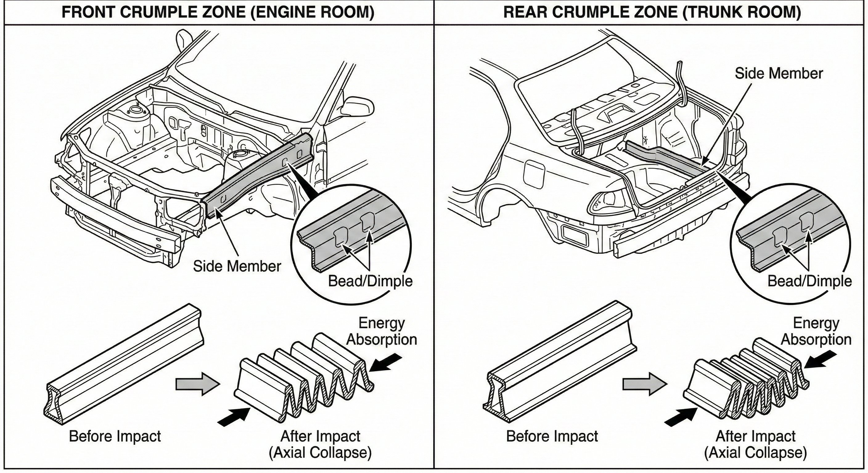 엔진룸과 트렁크 룸은 충돌 시 의도적으로 찌그러져야 하는 구간입니다. 멤버(Member) 내부에 비드(Bead)나 딤플(Dimple) 형상을 설계해 넣는 이유가 바로 이것입니다. 충돌 시 이 구조물들은 아코디언처럼 접히며(Axial Collapse) 충격 에너지를 흡수합니다.