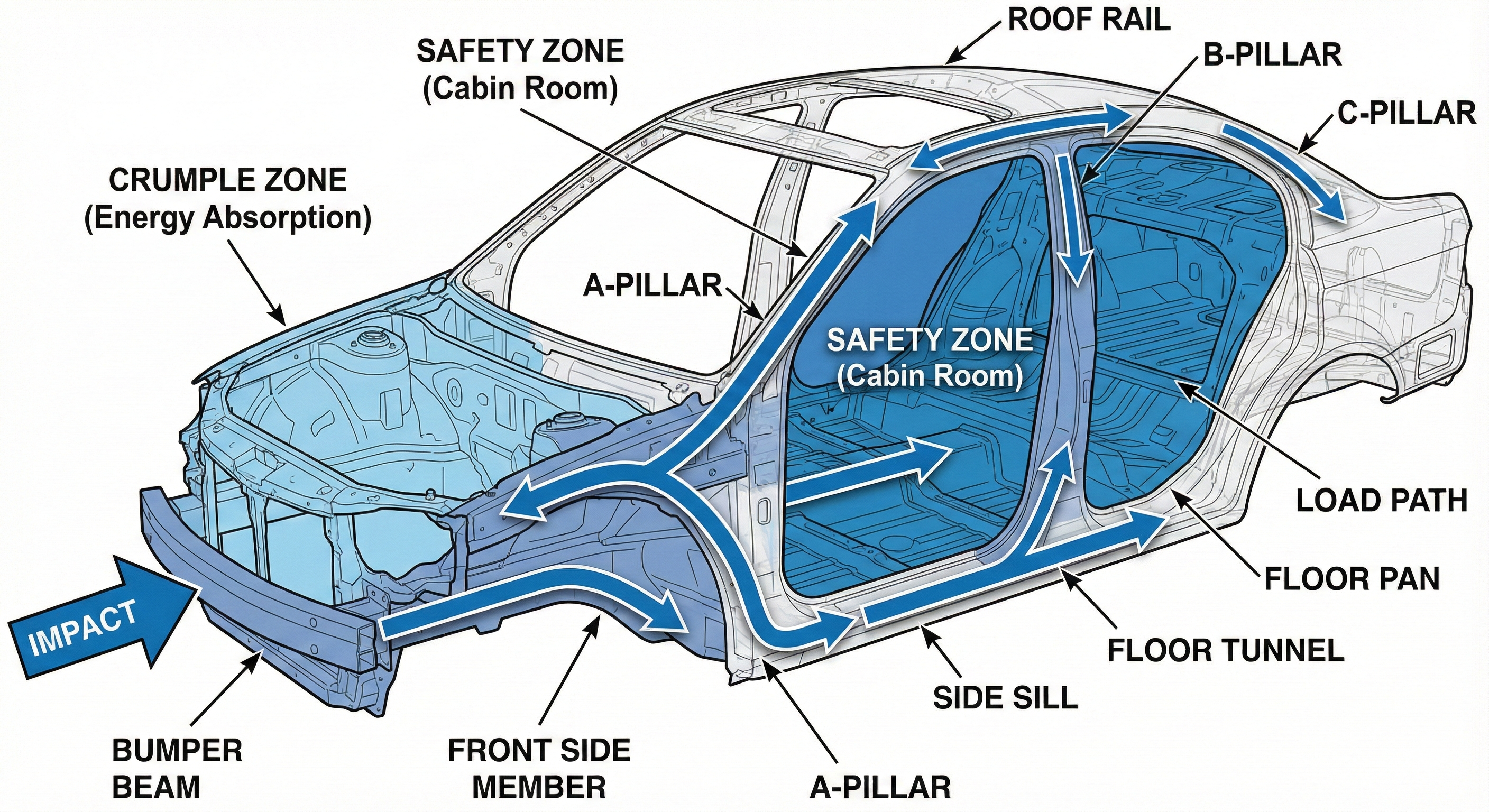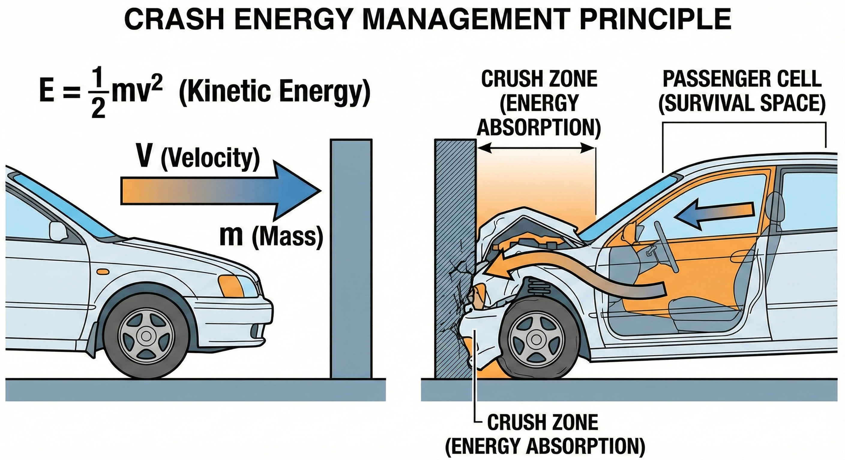 차체 설계 엔지니어에게 주어진 가장 큰 난제는 '충돌 에너지 관리(Crash Energy Management)'입니다. 물리학적으로 충돌 사고는 거대한 운동 에너지가 순식간에 차체로 전달되는 현상입니다. 엔지니어는 이 에너지를 어떻게 처리할지 명확한 전략을 세워야 합니다. 여기서 '크럼플 존(Crumple Zone)'과 '세이프티 존(Safety Zone)'의 개념이 등장합니다.