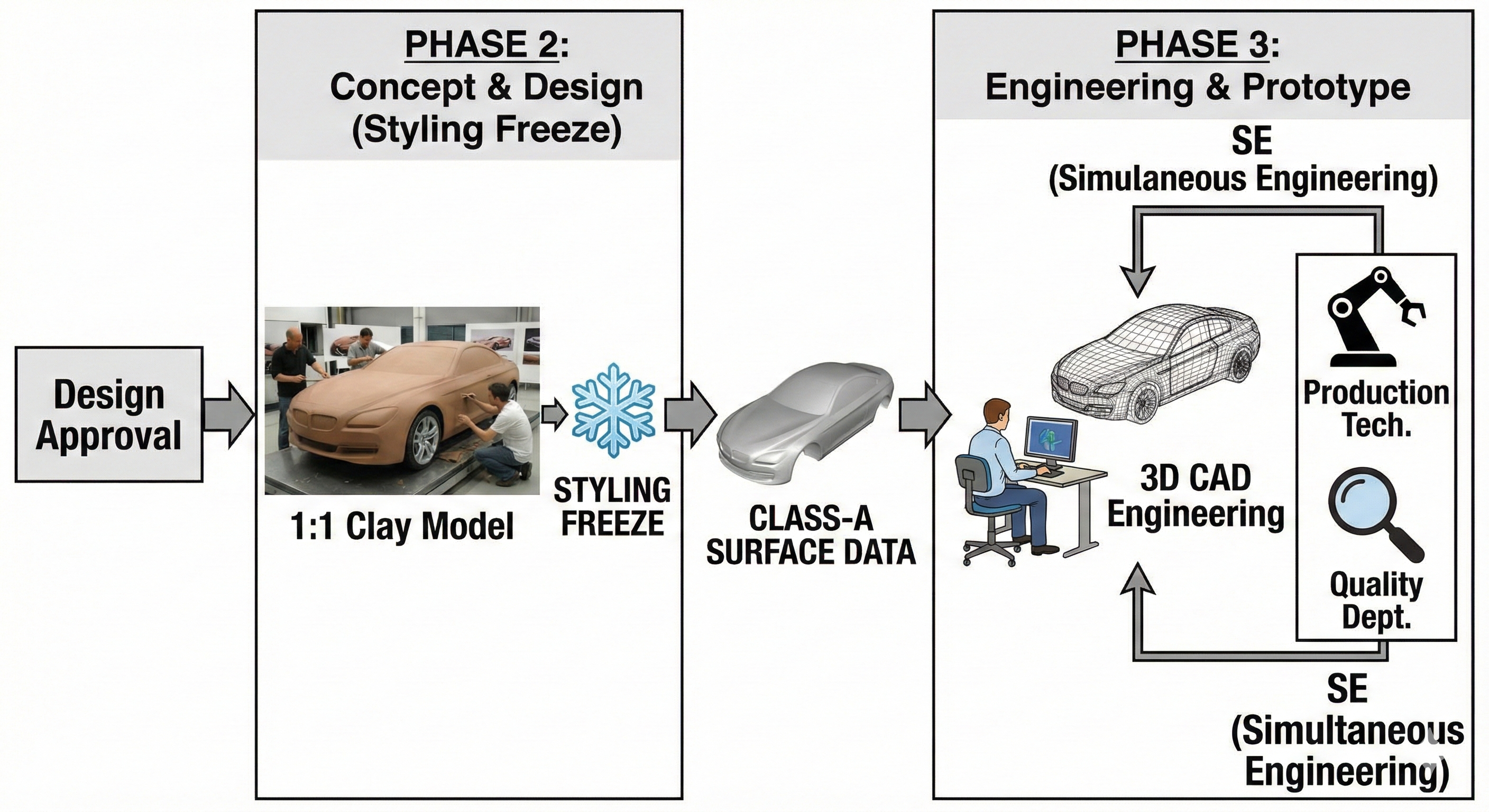 기획이 승인되면 디자이너와 엔지니어의 협업이 시작됩니다. 디자인 부서가 1:1 클레이 모델을 깎아 내/외장 형상을 최종 확정하는 스타일링 프리즈(Styling Freeze)가 선행되고, 그후 엔지니어들은 확정된 디자인 표면(Class-A Surface) 데이터를 기준으로 3D CAD 설계를 시작합니다. 이때 생산기술, 품질 부서가 설계 단계부터 참여하는 SE(동시공학) 활동을 통해 양산성을 미리 검토합니다.