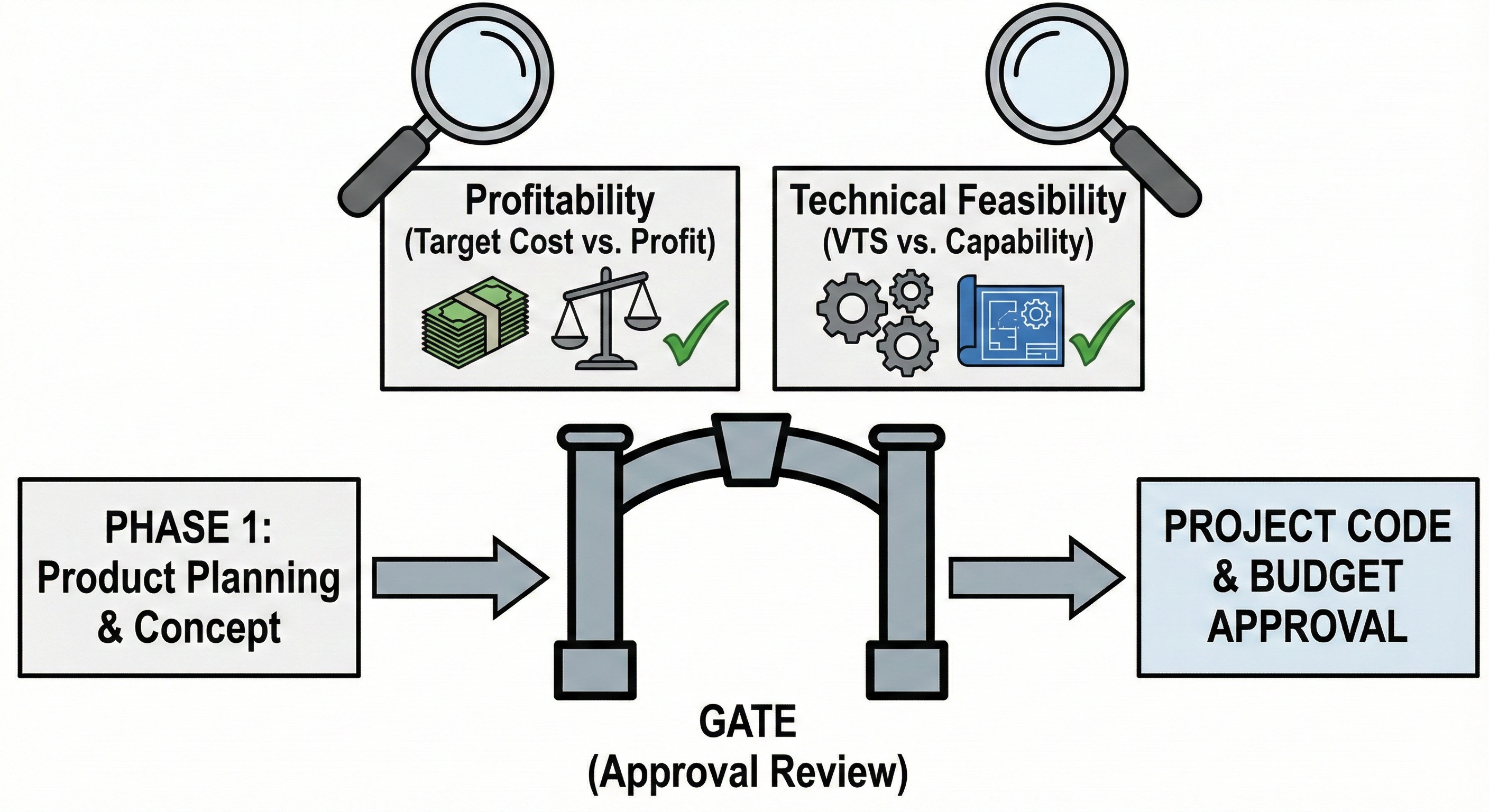 Phase 1의 Gate 승인 통과 기준은 두 가지입니다. 첫째는 수익성으로, 목표 원가(Target Cost) 내에서 개발하여 이익을 낼 수 있는지 검증합니다. 둘째는 기술적 타당성으로, 설정된 VTS가 현재의 기술력으로 구현 가능한지 판단합니다. 이 관문을 통과해야만 공식적인 프로젝트 코드가 부여되고 개발 예산이 승인됩니다.