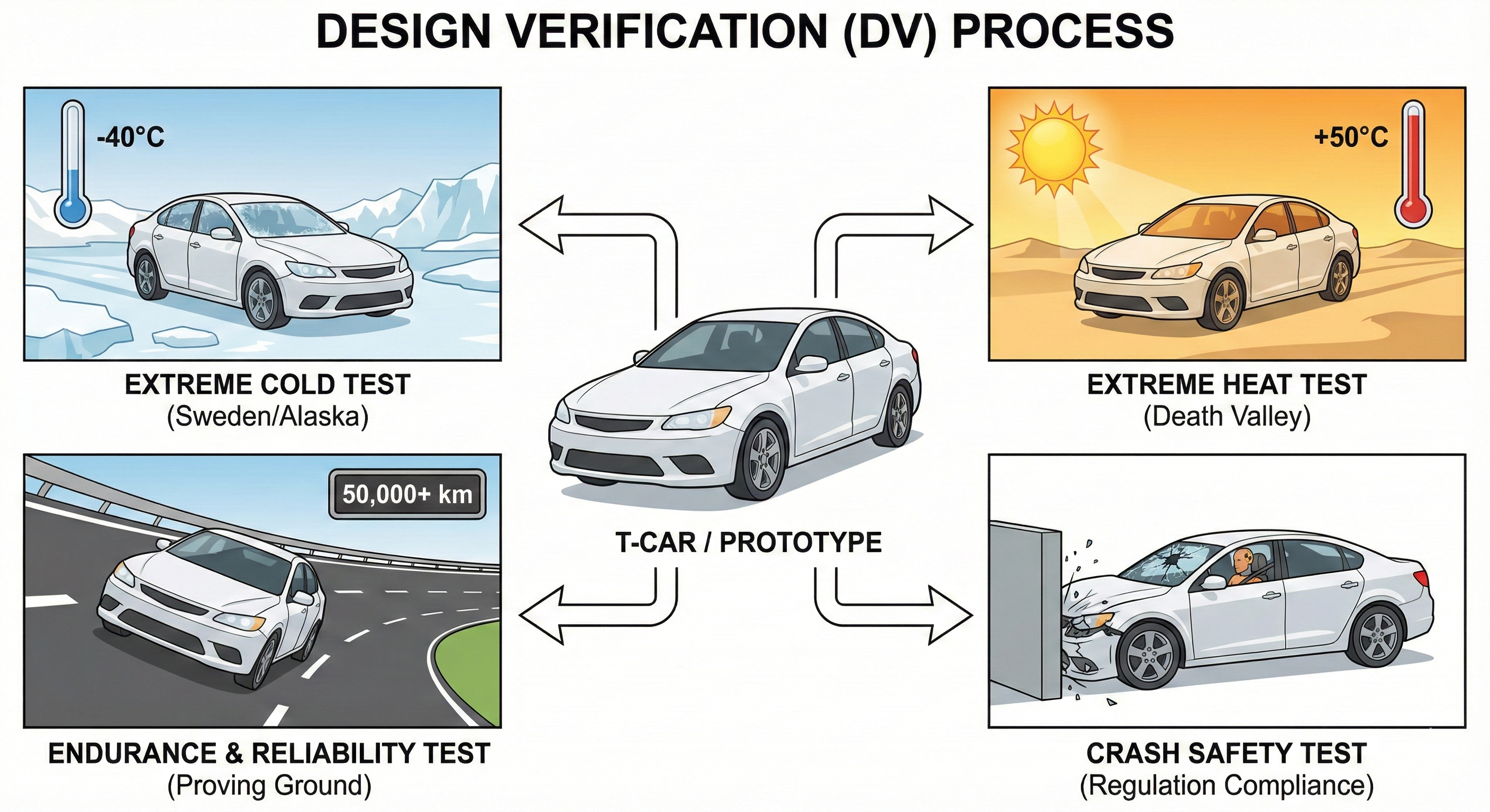 이 단계의 핵심 과업은 DV(Design Verification, 설계 검증)입니다. 제작된 T-Car와 프로토 차량은 스웨덴이나 알래스카의 혹한기, 데스밸리의 혹서기 등 여러 환경에서 테스트 주행을 하거나, 주행 시험장(Proving Ground)에서 수만 km를 달리며 파워트레인과 섀시의 내구 신뢰성을 검증합니다. 또한 실제 차량을 벽에 충돌시키는 법규 안전 시험도 이 시기에 수행됩니다.