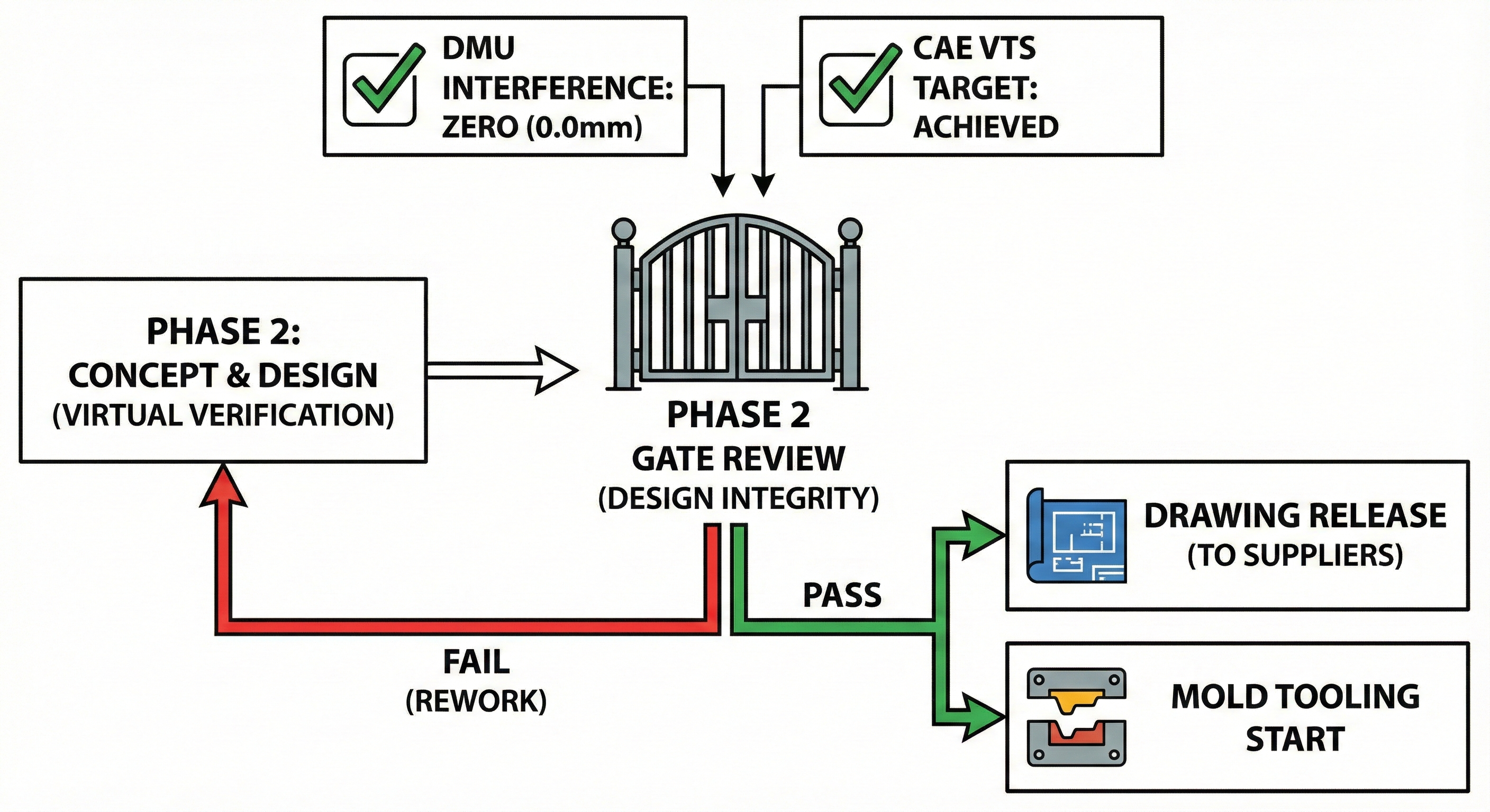 Phase 2 게이트의 핵심 기준은 '설계 무결성'입니다. 가상 조립(DMU)에서 간섭이 'Zero'인지, CAE 해석 결과가 VTS 목표를 달성했는지 확인합니다. 이 기준을 충족해야 비로소 유관 부서 및 협력사에게 도면이 배포(Release)되고 금형 제작이 시작됩니다.