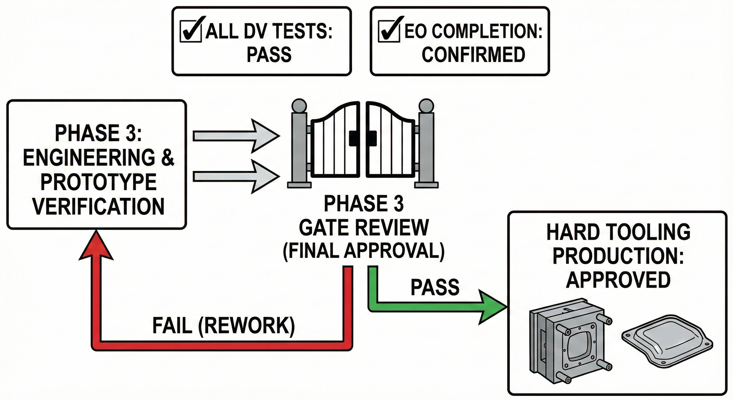Phase 3는 공장으로 넘어가기 위한 마지막 관문입니다. 따라서 게이트 항목으로는 모든 DV 시험 항목이 합격(Pass) 판정을 받았는가? 시험 중 발생한 결함에 대해 설계 변경(EO)이 완료되었는가? 등이 확인되어야 하며, 이를 통과해야 수십억 원이 투입되는 양산 금형(Hard Tool) 제작이 최종 승인됩니다.