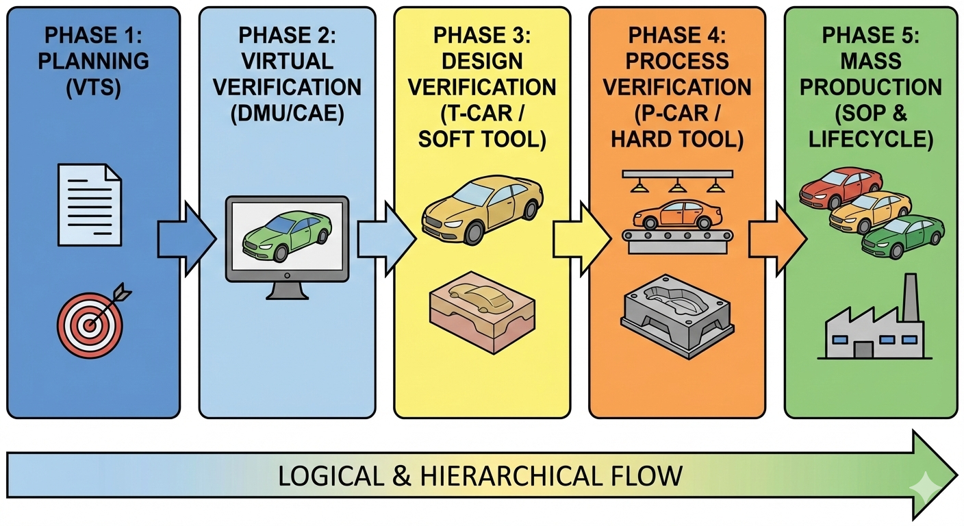 이처럼 자동차 개발은 기획(VTS) -> 가상 검증(DMU) -> 설계 검증(T-Car/Soft Tool) -> 공정 검증(P-Car/Hard Tool) -> 양산(SOP)이라는 논리적이고 위계적인 흐름을 따릅니다. 이후 포스팅부터는 [Phase 1]부터 심층적으로 다뤄보겠습니다.