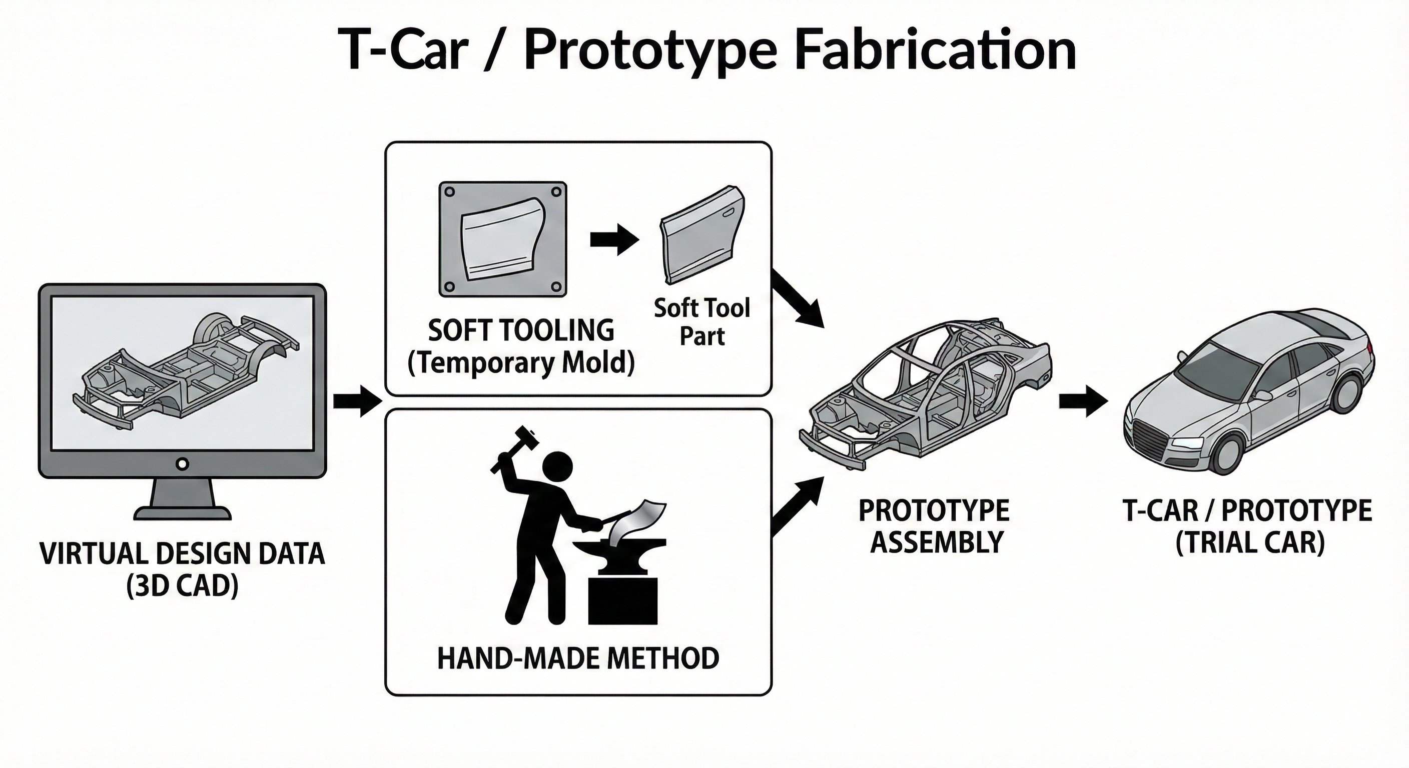 가상의 설계 데이터를 물리적 실체로 구현하는 단계입니다. 이때 제작되는 시험 차량을 T-Car(Trial Car)와 프로토타입(Proto)이라고 부릅니다. 중요한 점은 아직 양산 금형이 완성되기 전이므로, 소프트 툴(Soft Tool, 간이 금형)이나 수제작 방식을 통해 부품을 만들어 조립한다는 것입니다.