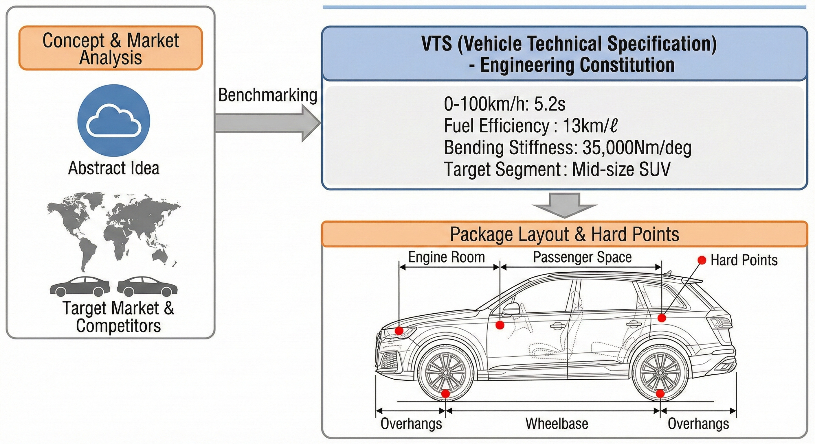 개발의 첫 단추는 '어떤 차를 만들 것인가'를 정의하는 것입니다. 이 단계의 핵심은 추상적인 아이디어를 '검증 가능한 수치'로 변환하고, 사업성을 확보하는 것입니다. 가장 먼저 타겟 시장과 경쟁 차종을 분석하는 벤치마킹(Benchmarking)을 통해 차급(Segment)과 판매 전략을 수립하고, 이를 기반으로 엔지니어링의 헌법이라 불리는 VTS(Vehicle Technical Specification)를 확정합니다. '제로백 5.2초, 연비 13km/ℓ, 굽힘 강성 35,000Nm/deg'와 같은 정량적 목표가 이때 설정되죠. 동시에 차량의 물리적 뼈대인 패키지 레이아웃(Package Layout)을 수행하여 엔진룸, 승객 거주 공간, 휠베이스 등의 하드 포인트(Hard Point)를 고정합니다.