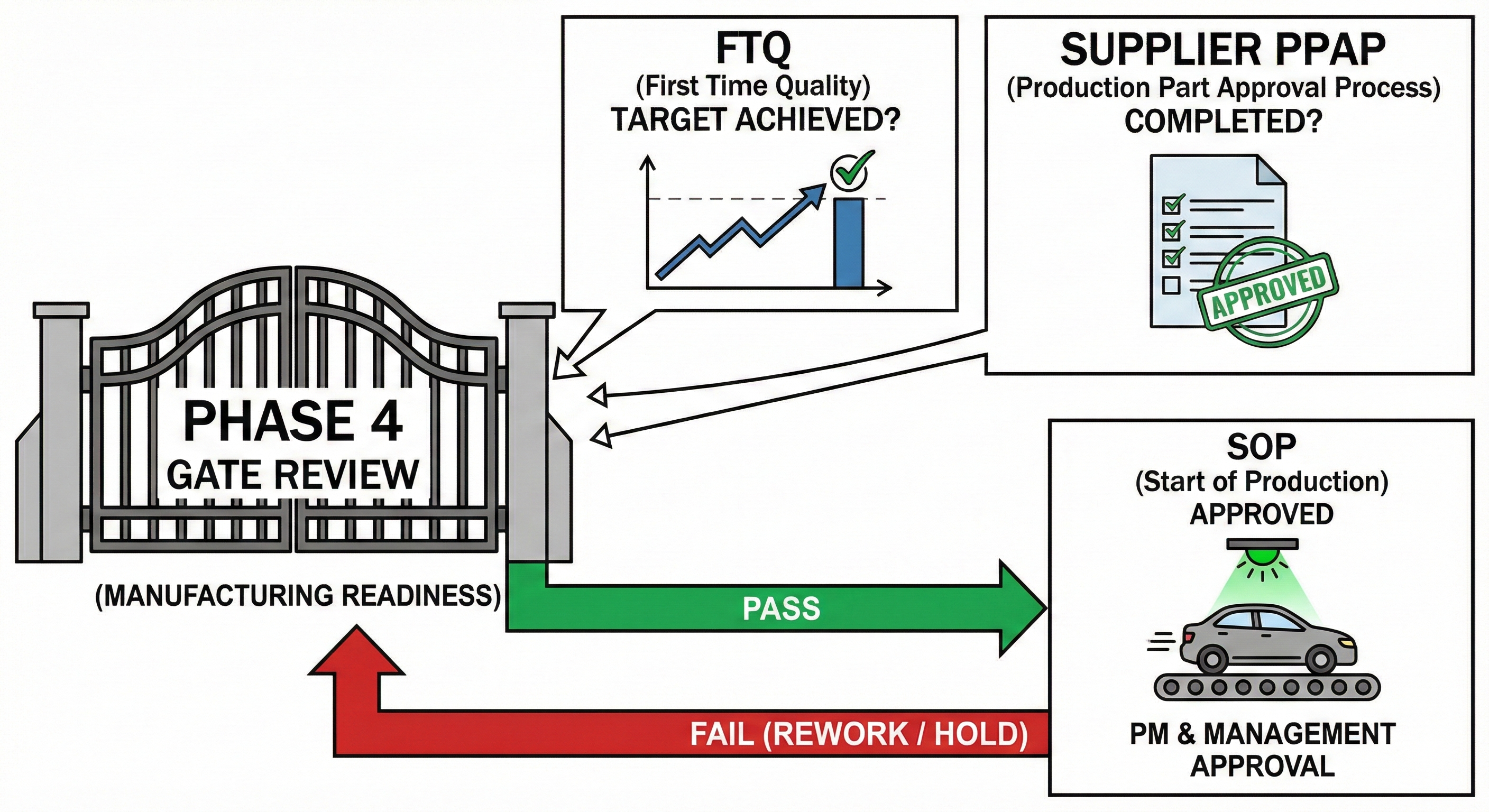 가장 중요한 Phase 4의 게이트 항목은 제조 준비 상태 심사입니다. 공장의 직행율(한 번에 합격하는 비율)이 목표치에 도달했는가? 모든 부품 협력사의 PPAP(부품 양산 승인)가 완료되었는가? 이 조건이 충족되어야 PM 및 경영층은 SOP(Start of Production)를 승인합니다.
