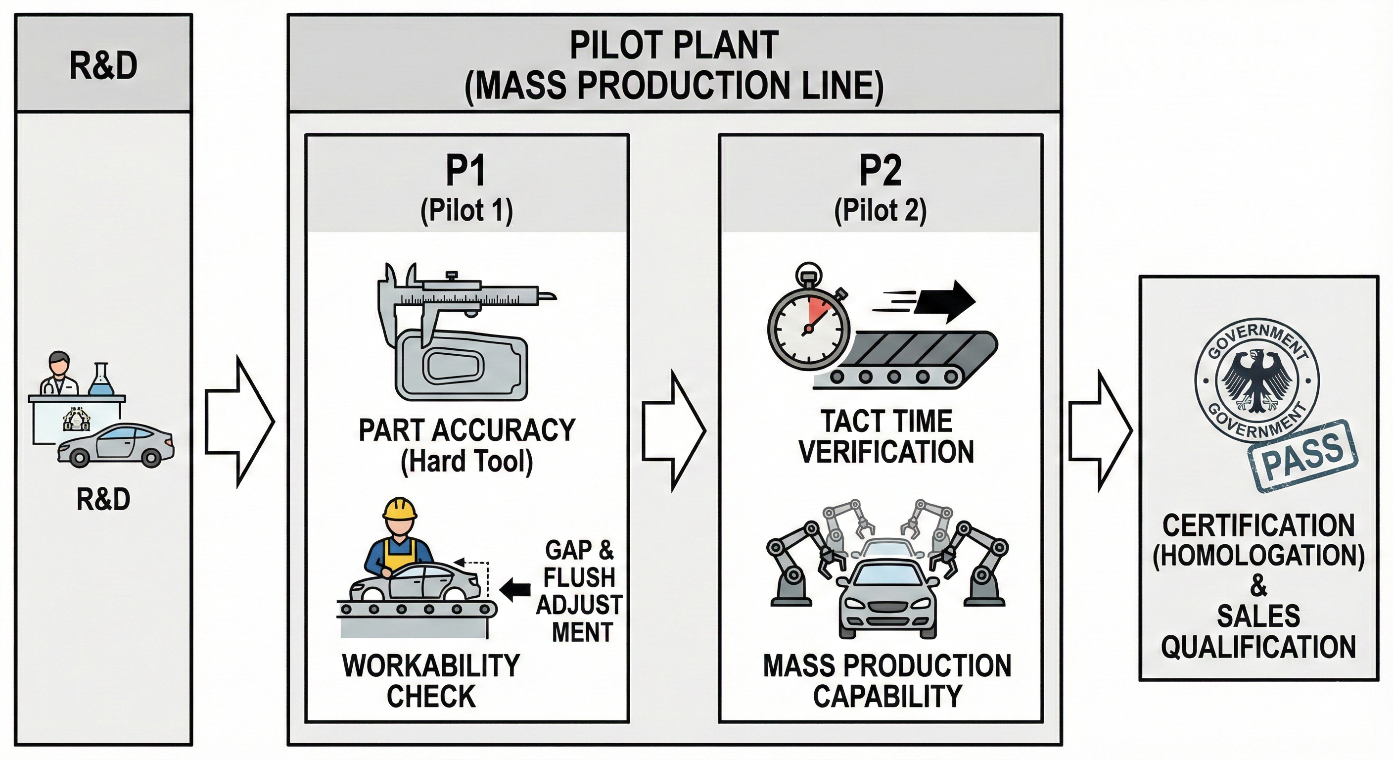 이제는 무대가 연구소에서 생산 공장(Plant)으로 이동합니다. 이 단계를 파이롯트(Pilot)라고 하며, Phase 3와 결정적인 차이는 '양산 금형(Hard Tool)'으로 찍어낸 정품 부품을 사용하여, 실제 양산 라인에서 조립한다는 점입니다. 파이롯트 과정은 통상 P1, P2로 세분화됩니다. P1에서는 부품의 치수 정밀도와 조립성(Workability)을 중점적으로 확인하여 단차를 잡습니다. P2에서는 실제 양산 라인의 속도(Tact Time)대로 설비를 가동하며 대량 생산 능력을 검증합니다. 동시에 이 단계에서 생산된 차량으로 정부 기관의 인증(Homologation)을 획득하여 판매 자격을 얻습니다.