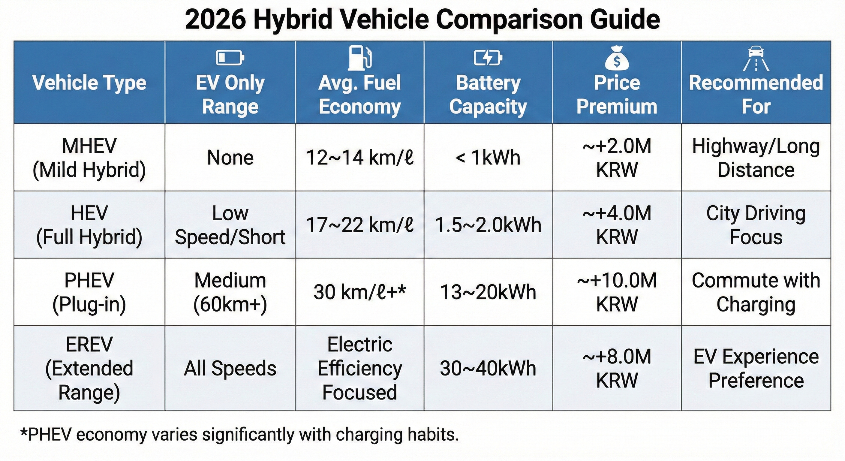 소비자의 주행 환경에 따른 합리적 선택을 돕기 위해 2026년 표준 데이터를 바탕으로 비교표를 구성했습니다.