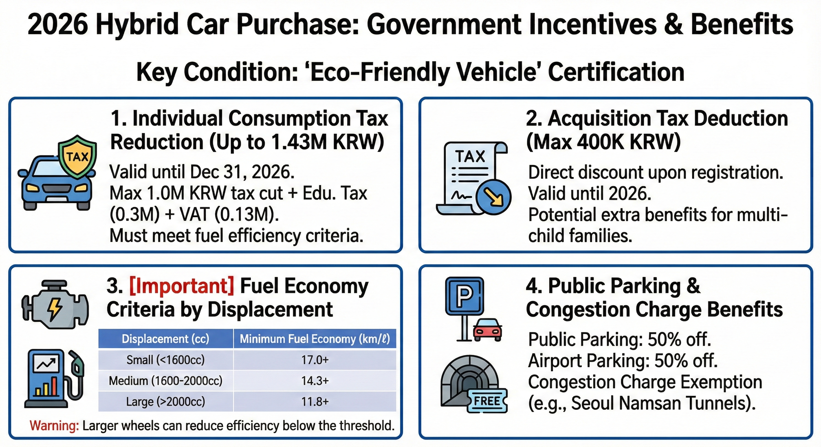 2026년은 하이브리드 세제 혜택이 유지되는 사실상 마지막 구간이 될 가능성이 큽니다. 기술적으로 성숙기에 접어든 HEV와 전기차의 대안으로 떠오른 EREV 중 본인의 주행 환경에 맞는 모델을 선택하십시오. 특히 143만 원의 개소세 혜택과 40만 원의 취득세 공제는 실구매가를 낮추는 강력한 무기입니다. 연비 기준을 꼼꼼히 체크하여 혜택에서 누락되지 않는 현명한 선택을 하시길 바랍니다.