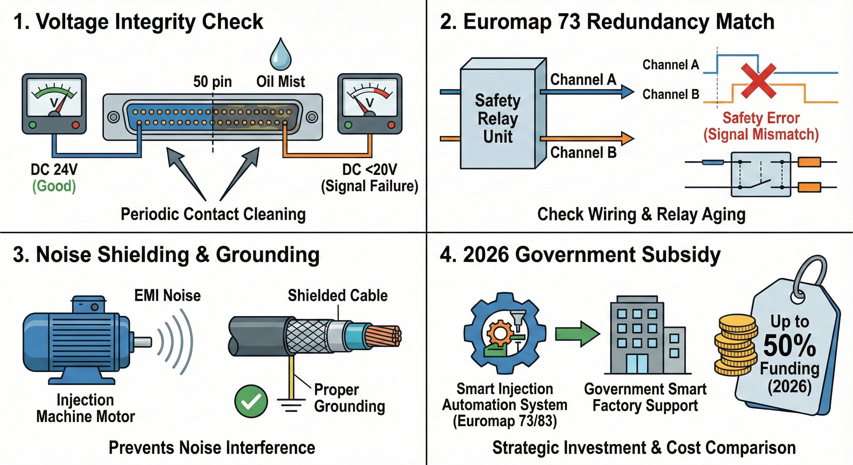 - 노이즈 차폐 처리: 사출기 모터 구동 시 발생하는 전자파 노이즈가 통신선에 침투하지 않도록 쉴드 케이블(Shielded Cable)의 접지 상태를 확인하십시오.