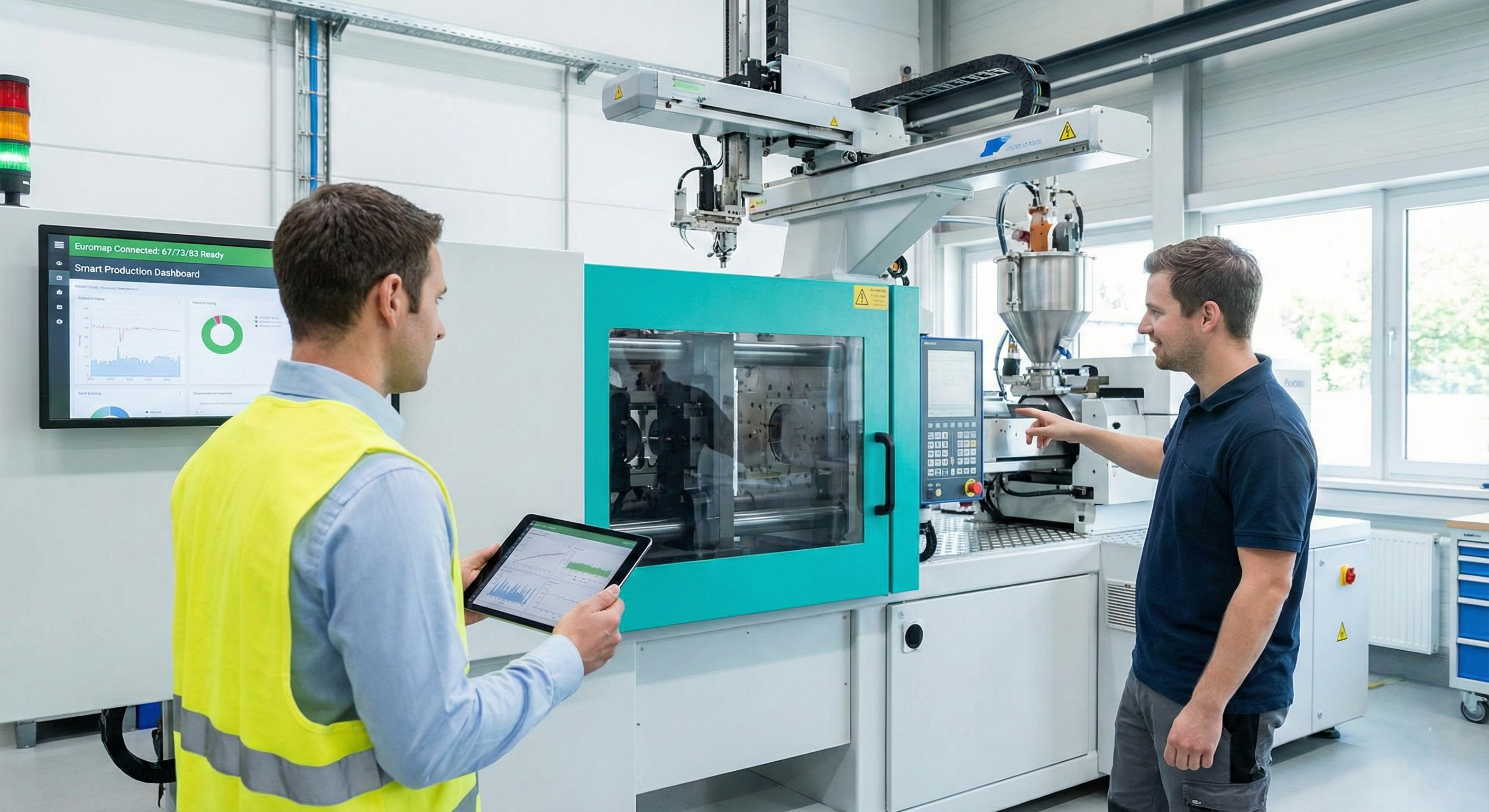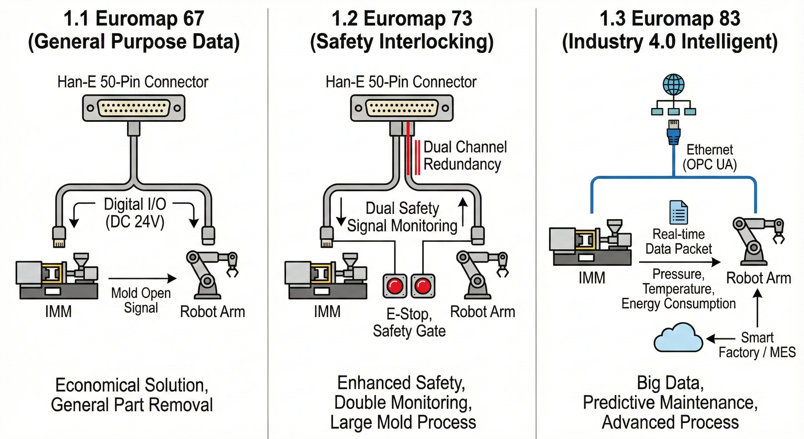 물리적 핀 연결 대신 이더넷(Ethernet) 기반의 OPC UA 통신을 사용하는 차세대 규격입니다. 단순한 동작 신호를 넘어 금형의 압력, 수지 온도, 로봇의 에너지 소비량 등 수천 개의 실시간 데이터를 패킷 단위로 전송합니다. 스마트 팩토리의 MES(제조실행시스템) 연동과 빅데이터 기반 예측 정비가 필요한 첨단 공정에 적용됩니다.