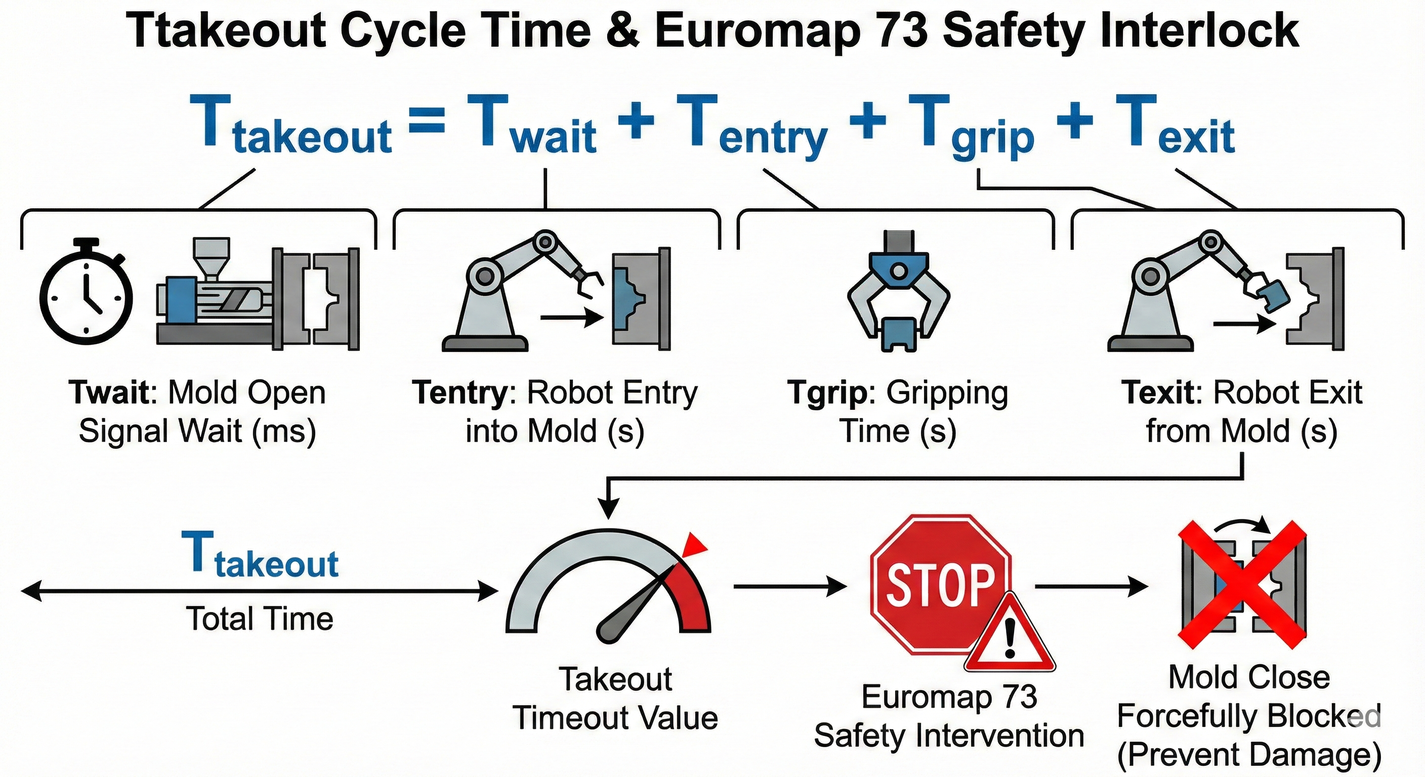 취출 사이클 타임(Ttakeout) 수식을 한 줄씩 상세하게 구분하여 정리하였습니다. 이 수식의 각 변수는 자동화 공정의 생산 수율과 직결됩니다. 이 수식에 따라 산출된 합계 시간이 사출기에 설정된 '취출 타임아웃(Timeout)' 값을 초과할 경우, 유로맵 73 규격은 이를 이상 상황으로 간주하고 금형 폐쇄(Mold Close) 동작을 강제로 차단하여 대형 파손 사고를 예방합니다.