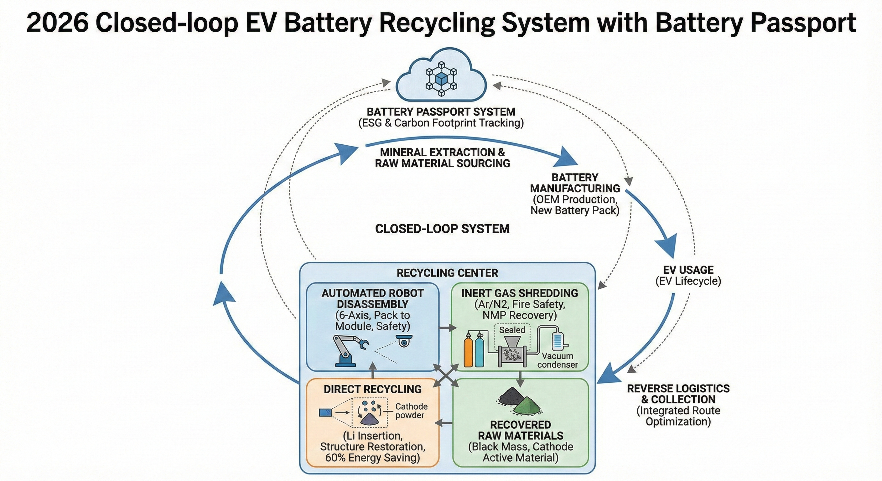 글로벌 완성차 제조사들은 2026년부터 배터리 여권(Battery Passport) 시스템을 통해 배터리의 광물 채굴 단계부터 재활용 단계까지의 모든 탄소 발자국을 추적합니다. 이에 따라 재활용 사업자는 단순한 Tier 2 협력사를 넘어 OEM의 ESG 경영 및 탄소 국경세 대응을 위한 전략적 파트너로서의 지위를 갖게 됩니다. 제조 공정은 폐쇄 루프(Closed-loop) 시스템을 지향하며, 이는 수거된 배터리가 다시 신차 배터리의 원료로 공급되는 구조를 의미합니다.