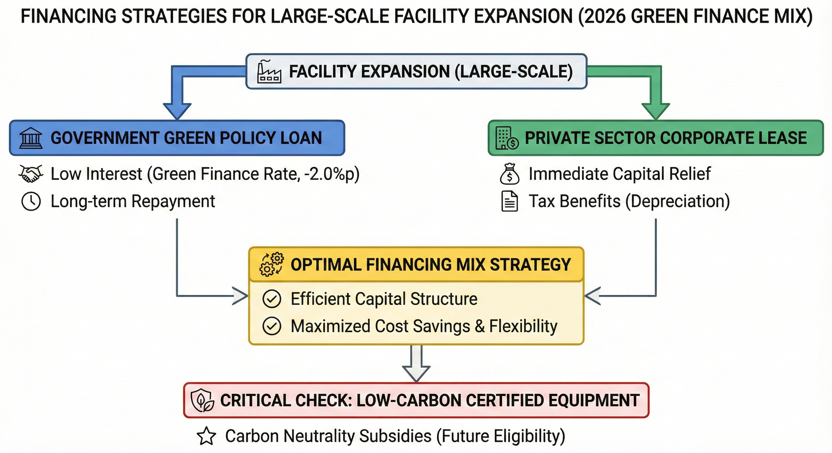 사업 확장 단계에서 대규모 시설 확충이 필요할 경우, 정부가 지원하는 환경 정책 자금 융자와 민간 금융권의 법인 리스를 혼합하는 믹스 전략이 가장 효율적입니다. 특히 2026년부터 시행되는 그린 금융 우대 금리 제도를 활용하면 일반 대출 대비 약 2.0%p 낮은 금리로 설비 자금을 조달할 수 있습니다. 구매 시에는 반드시 설비의 탄소 배출 저감 인증 유무를 확인하여 향후 탄소 중립 보조금 추가 신청 자격을 확보하시기 바랍니다.