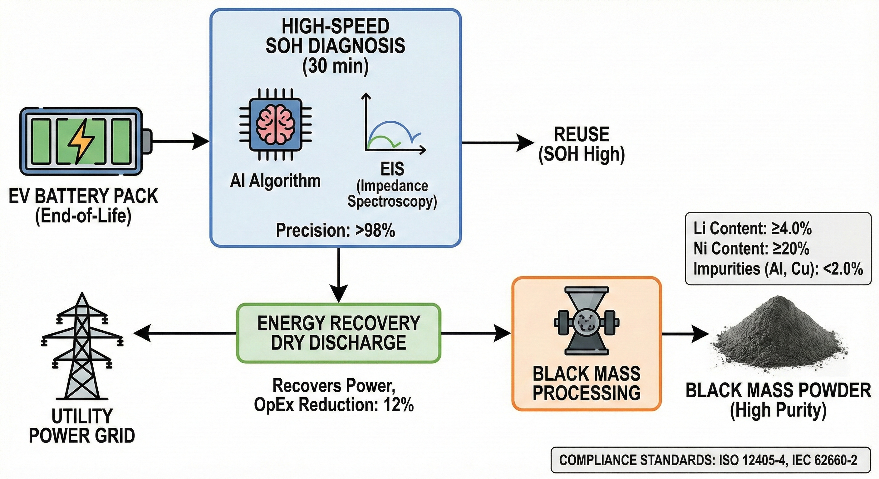 2026년 표준 공정에서는 배터리의 잔존 가치를 판정하는 SOH 평가 단계에서 인공지능 알고리즘과 임피던스 분광법(EIS)이 결합된 고속 진단 시스템이 적용됩니다. 이는 과거 8~12시간이 소요되던 완전 충방전 방식을 대체하여 단 30분 만에 배터리의 재사용 혹은 재활용 여부를 98% 이상의 정밀도로 판정합니다. 재활용 공정으로 투입된 배터리는 이후 블랙매스 공정을 통해 유가 금속이 농축된 파우더 형태로 가공됩니다.