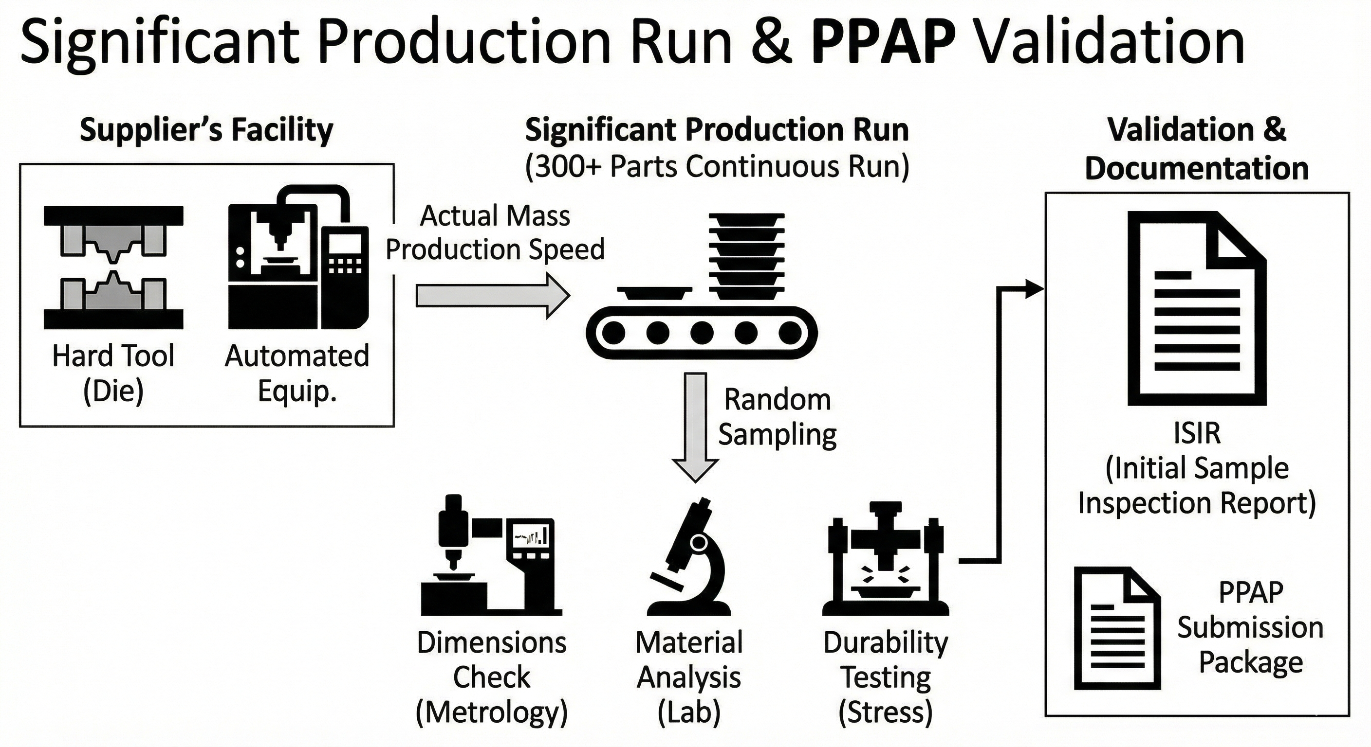 협력사는 임시 설비가 아닌 실제 양산용 금형(Hard Tool)과 자동화 설비를 이용하여 실제 가동 속도로 최소 수백 대분 이상의 부품을 연속 생산하는 '양산 시편 생산(Significant Production Run)'을 수행합니다. 이 과정에서 생산된 부품들은 무작위로 추출되어 도면상의 모든 치수와 재질 성분, 그리고 가혹한 내구 성능 시험을 거치게 되며, 그 결과물은 초물검사보고서(ISIR)에 기록됩니다.