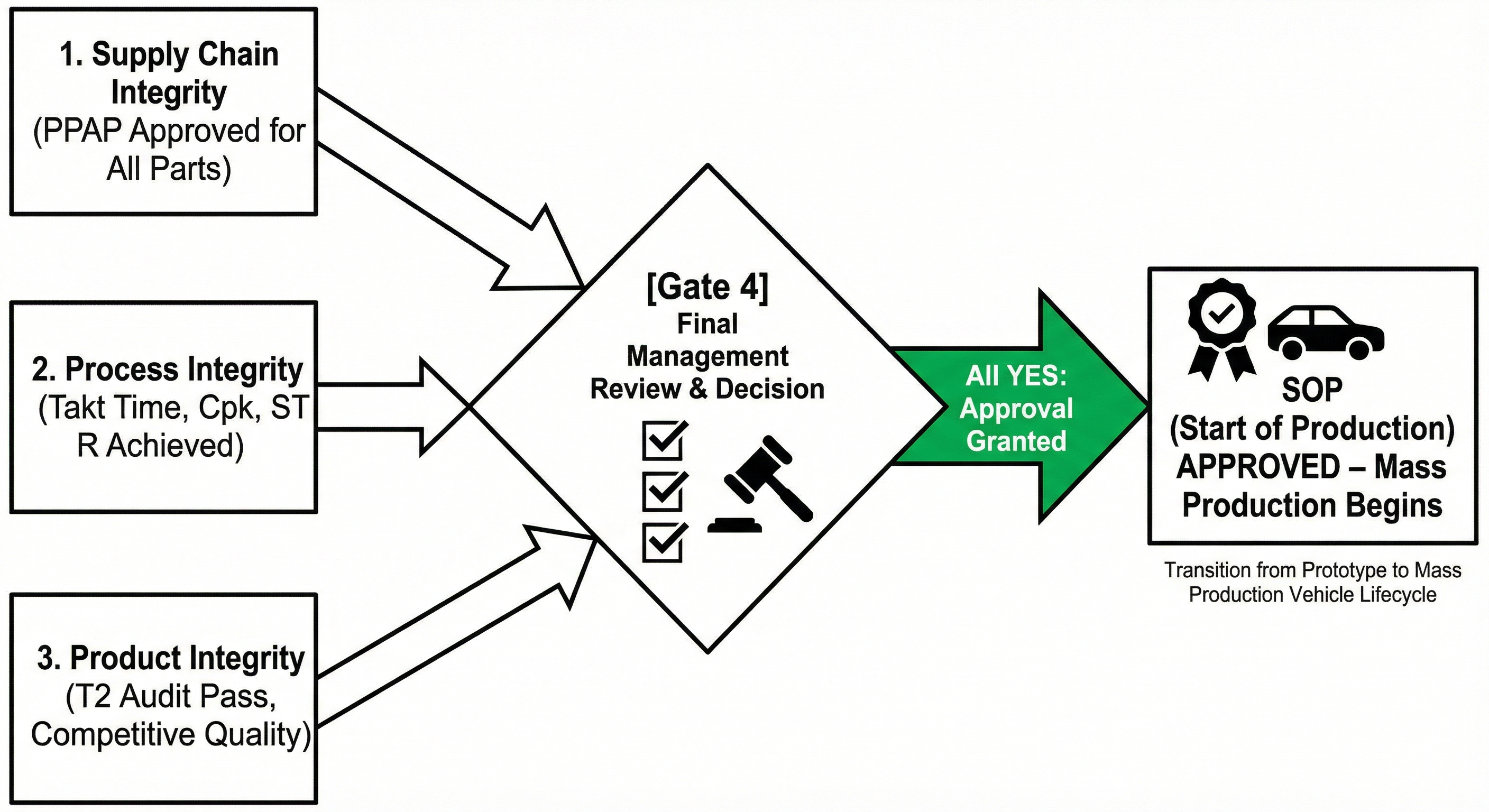 Phase 4-2의 모든 기술적, 통계적 검증 데이터는 프로젝트의 최종 의사결정 자리인 [Gate 4]로 모이게 됩니다. 경영진은 이 단계에서 세 가지 무결성을 최종 검토하여 SOP(Start of Production, 양산 개시)를 승인합니다.