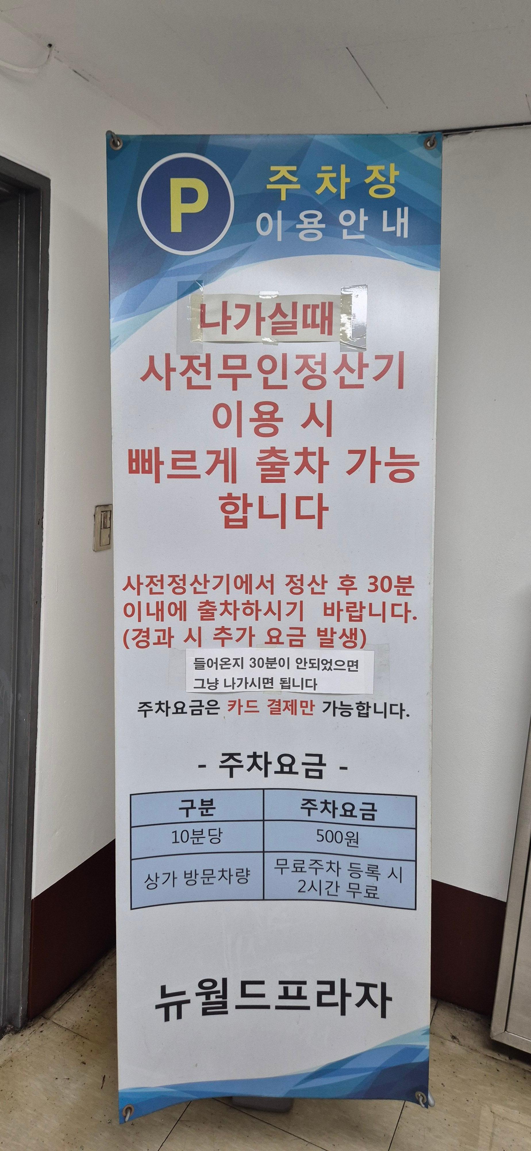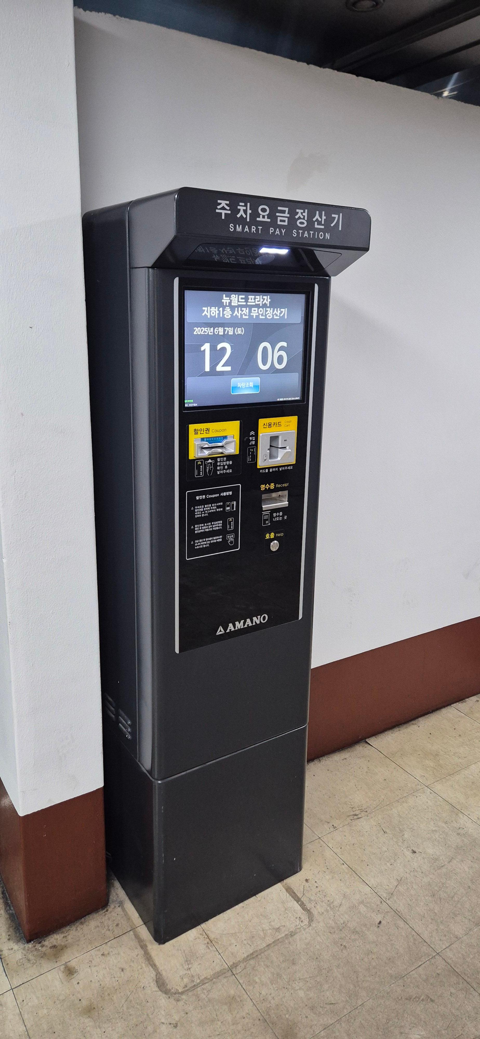 뉴월드프라자 주차장은 무인 사전정산 시스템으로 운영되며, 카드 결제만 가능합니다