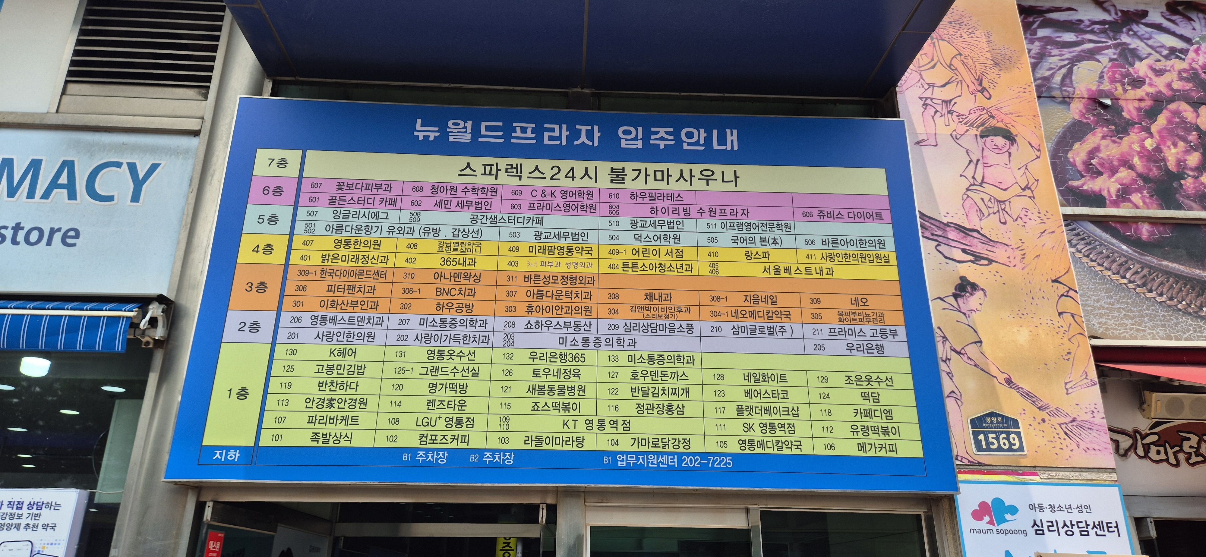 식당, 병원, 사우나 등등 상당히 다양한 매장이 입점해 있는 곳이에요