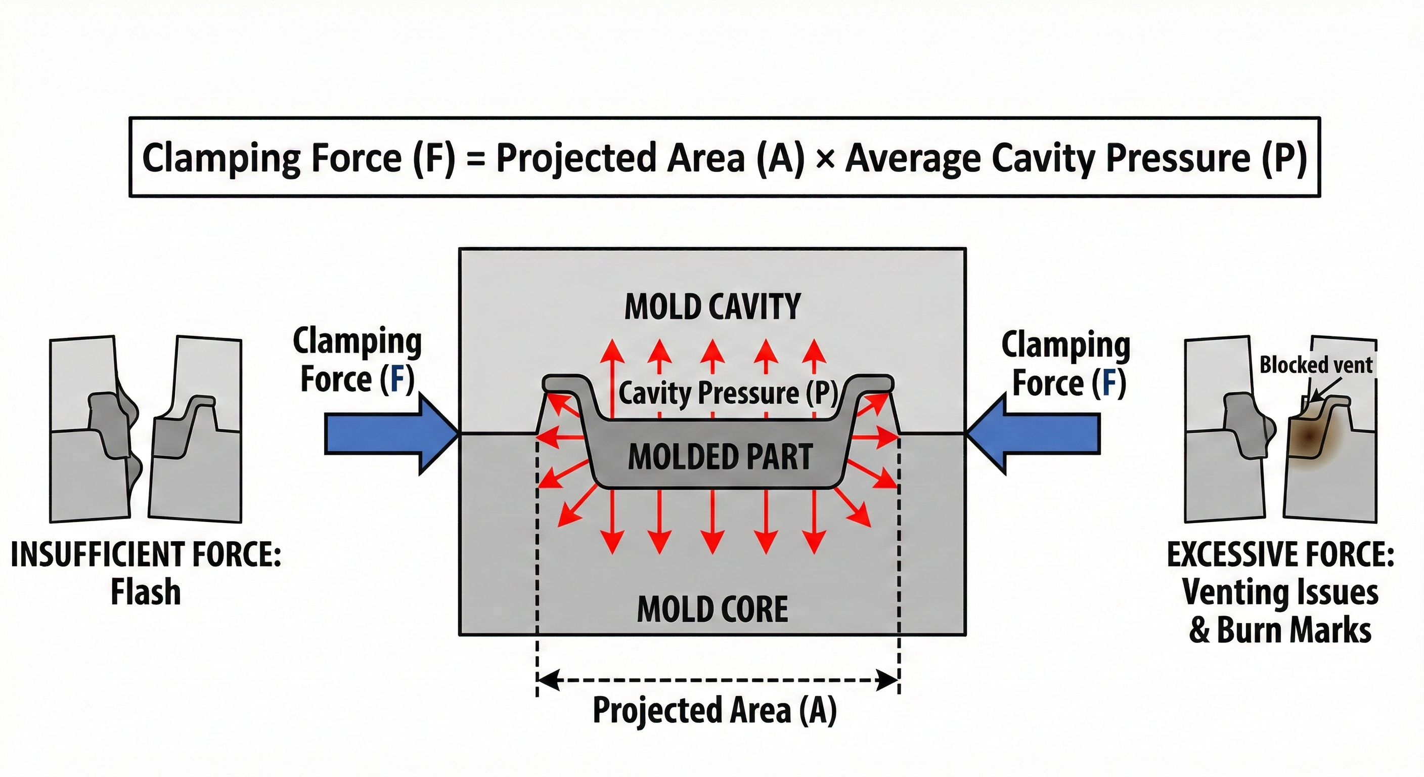 형체 장치는 고압의 수지가 금형 내부로 들어올 때 발생하는 내부 압력에 저항하여 금형을 닫힌 상태로 유지합니다. 모델 선정 시 "금형의 투영 면적() × 캐비티 내 평균 압력()" 공식을 통해 필요한 형체력(Tonnage)을 먼저 계산해야 합니다. 형체력이 부족하면 제품 테두리에 불필요한 수지가 남는 '플래시(Flash)' 현상이 발생하고, 과도하면 금형과 기계에 무리가 가며 가스 배출(Venting)이 원활하지 않아 제품이 타는 현상이 발생할 수 있습니다.